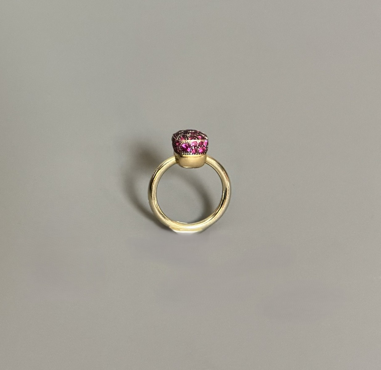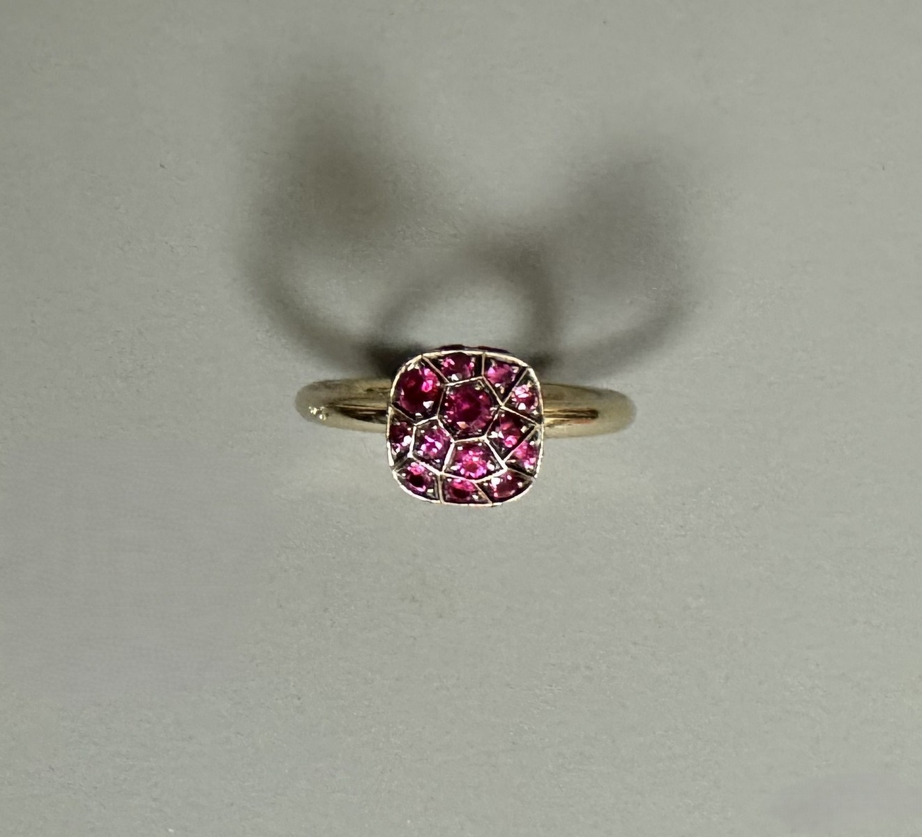 POMELLATO. 750°/°° yellow gold ring, “Nudo Solita” model, adorned with rubies. Signed and numbered. With original case and box. TDD.54.