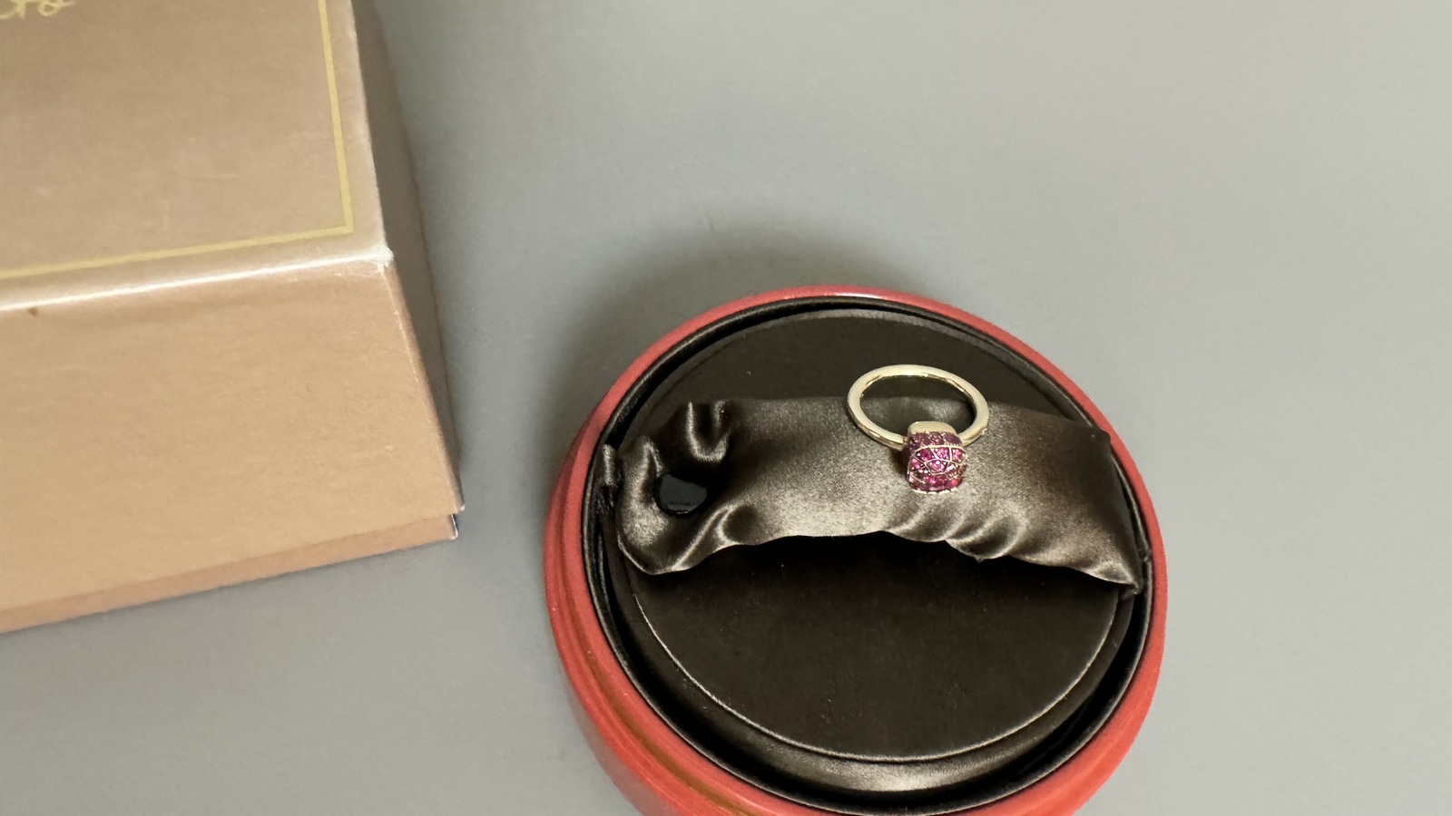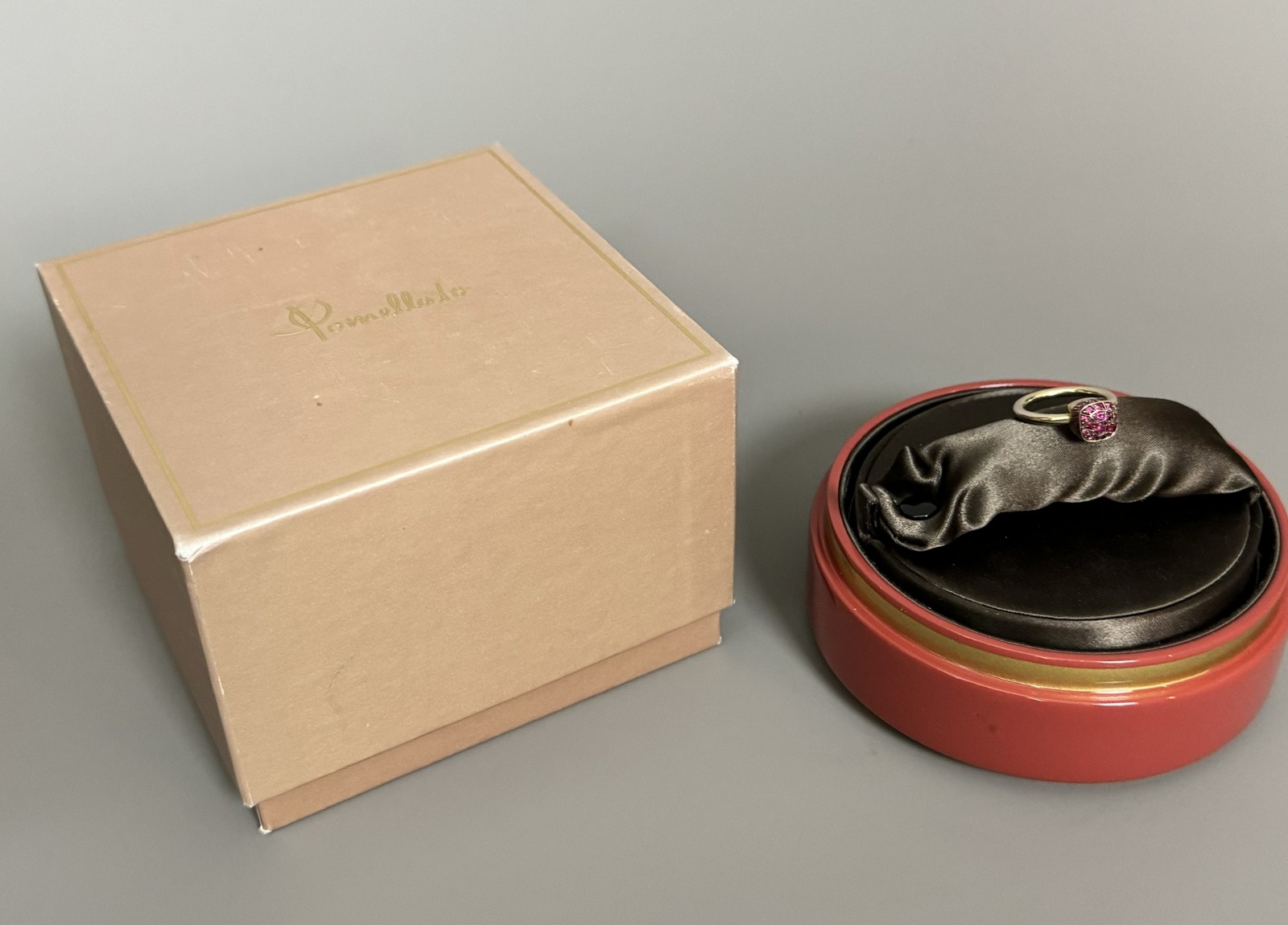 Lot 53 - POMELLATO. 750°/°° yellow gold ring, “Nudo Solita” model, adorned with rubies. Signed and numbered. With original case and box. TDD.54.
