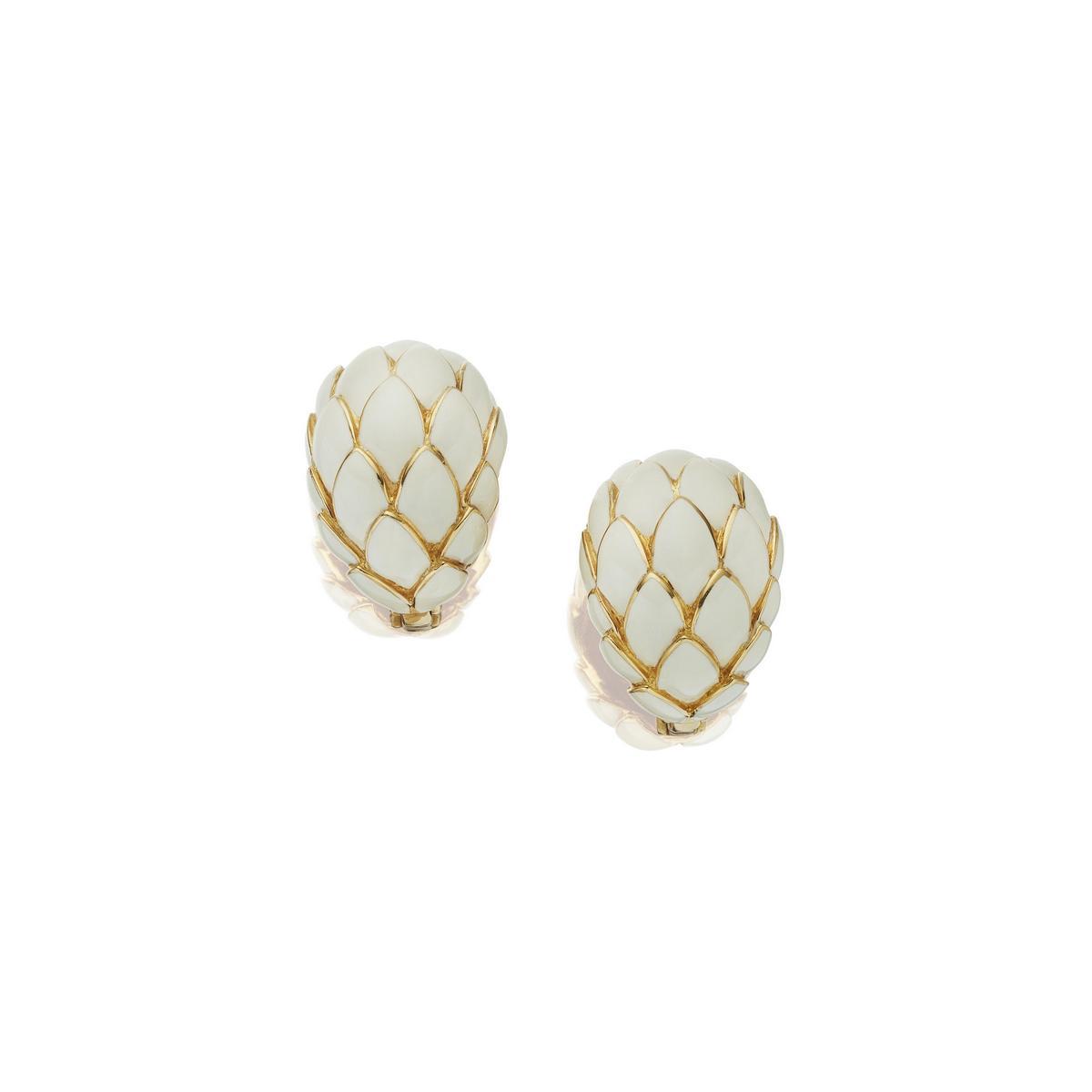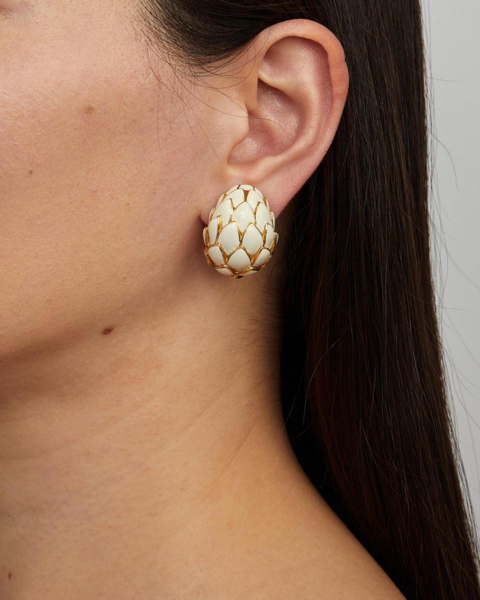 Designed as domes of scale-like enamel; mounted in 18k gold; Height: 3 cm – Width: 2.3 cm.