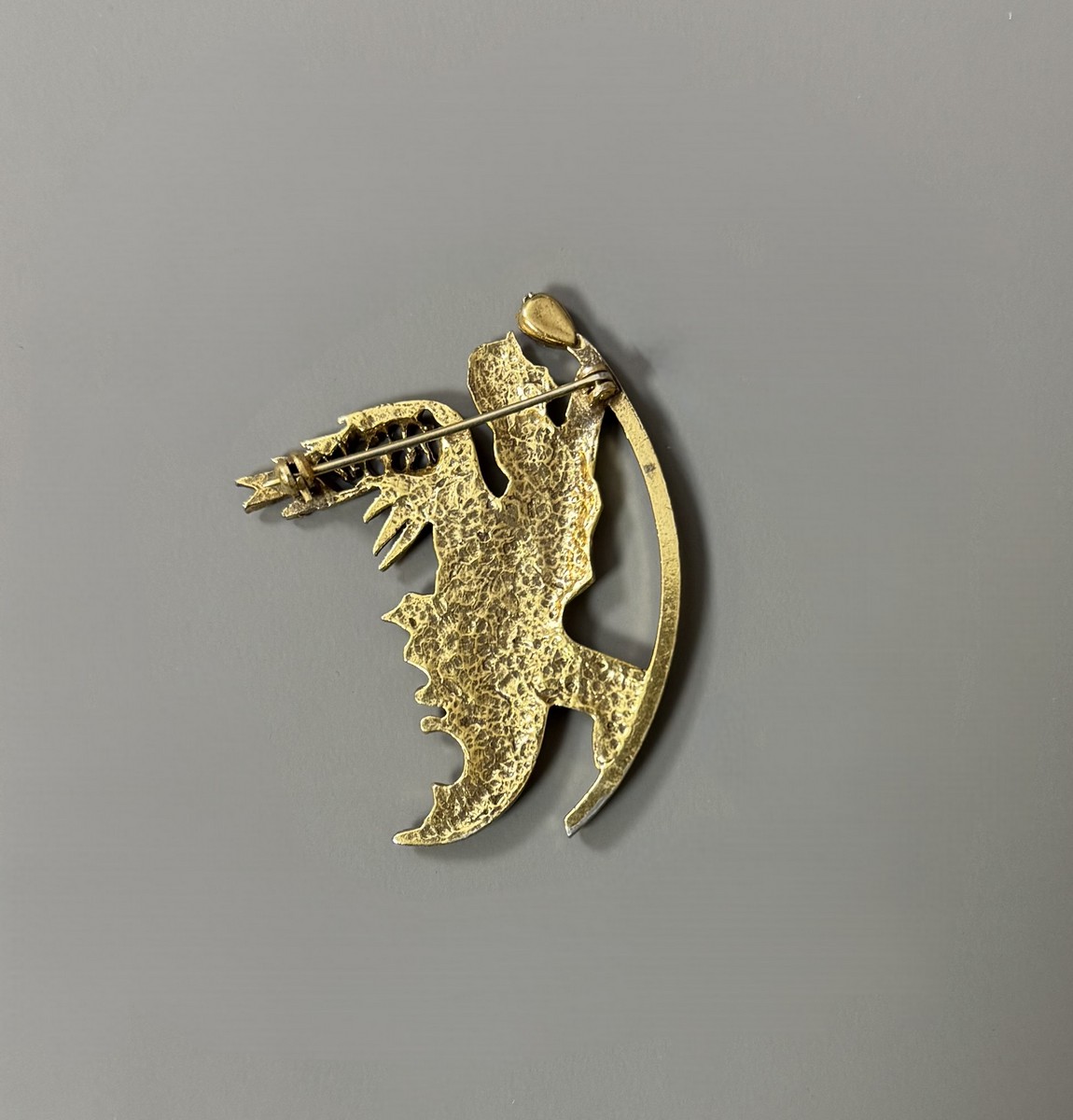 Gilt bronze and turquoise brooch in the shape of a teardrop. Signed "Dali" on the front and dated 1966. Inscribed in Hebrew "Israel" on its perforated wing.