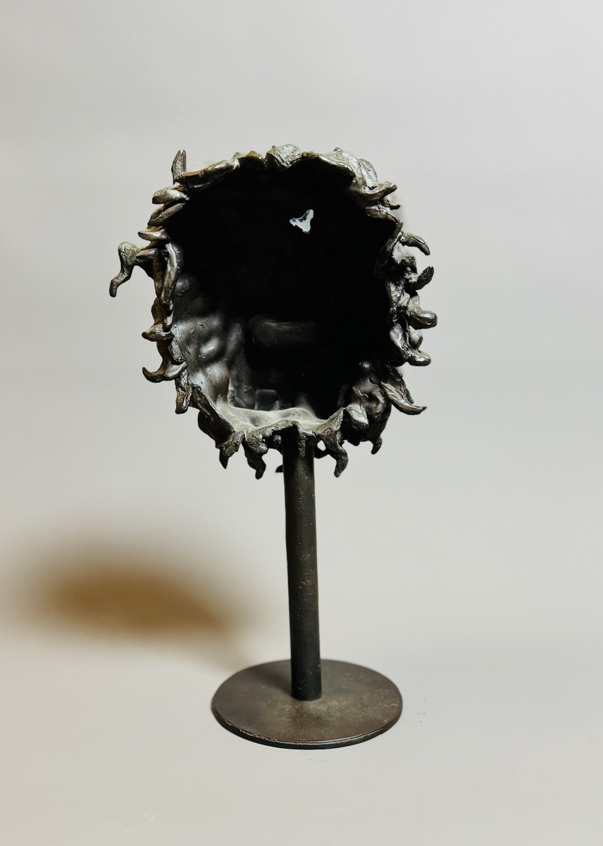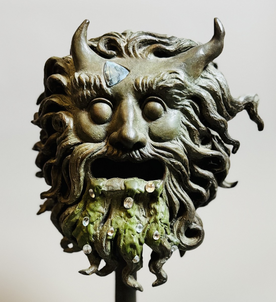 Patinated bronze sculpture with cut glass inlays depicting precious stones.