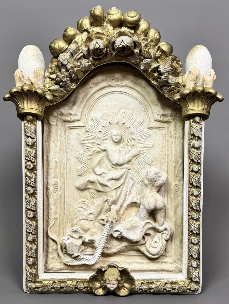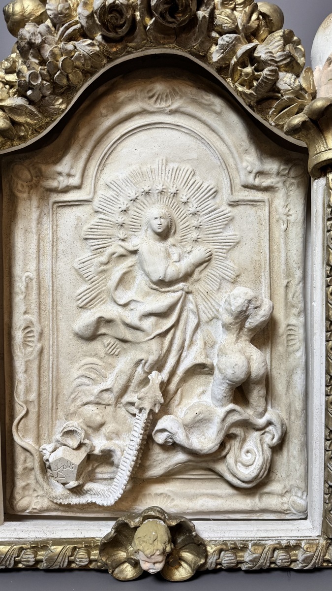 Plaster, gilding. Unique piece. Signed and dated «1966» at the lower left.