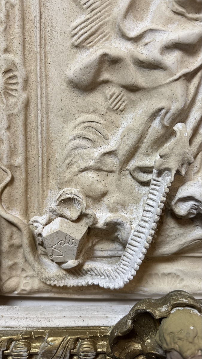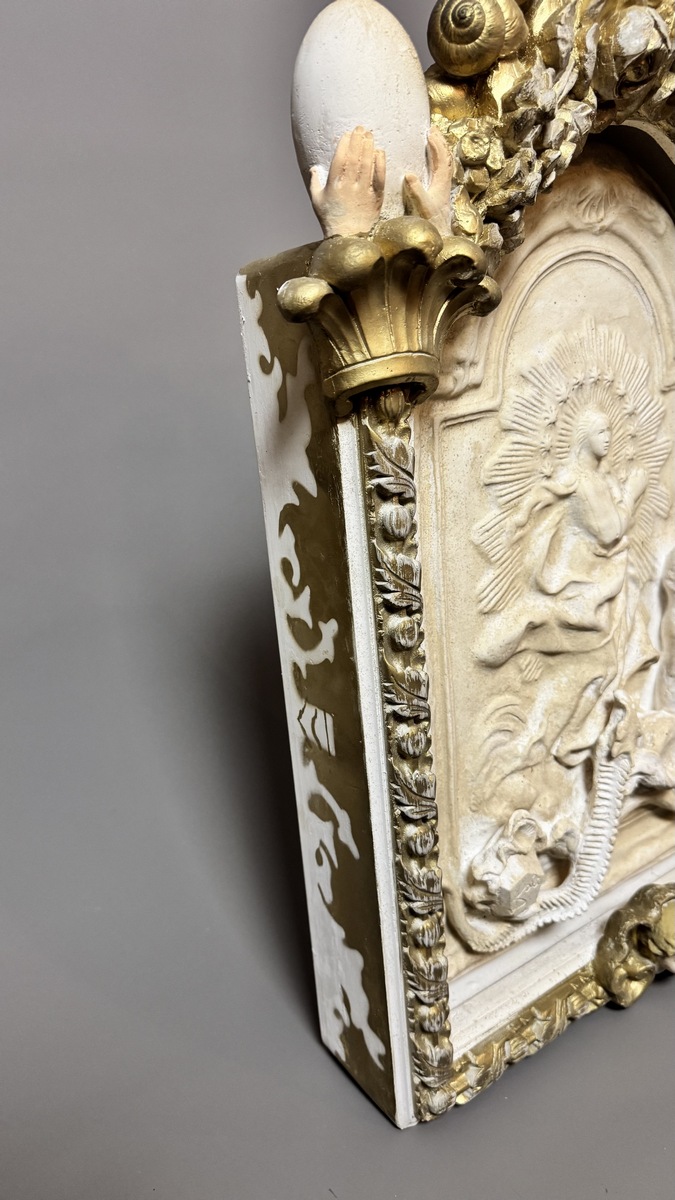 Plaster, gilding. Unique piece. Signed and dated “1966” lower left.