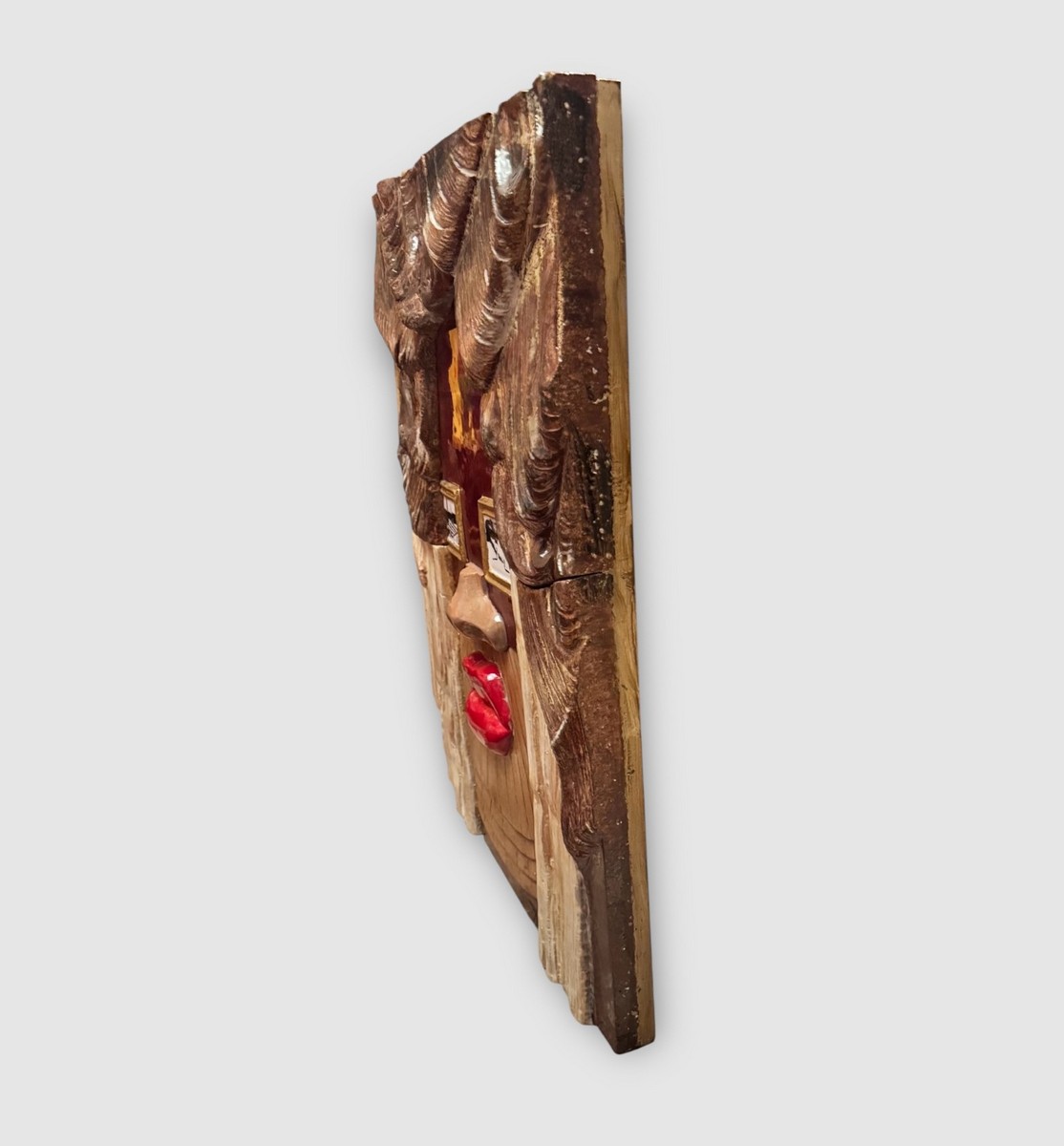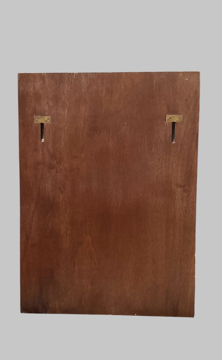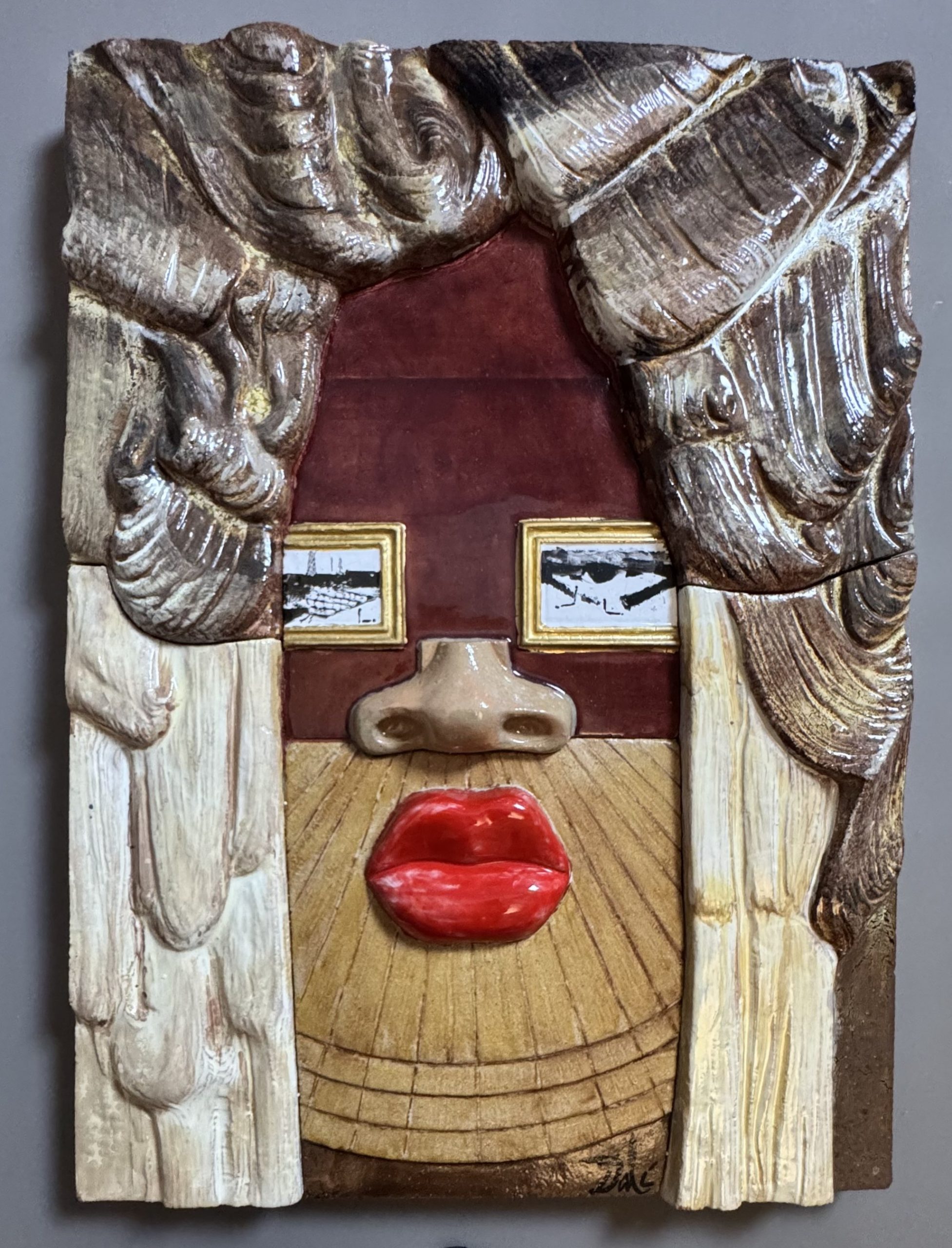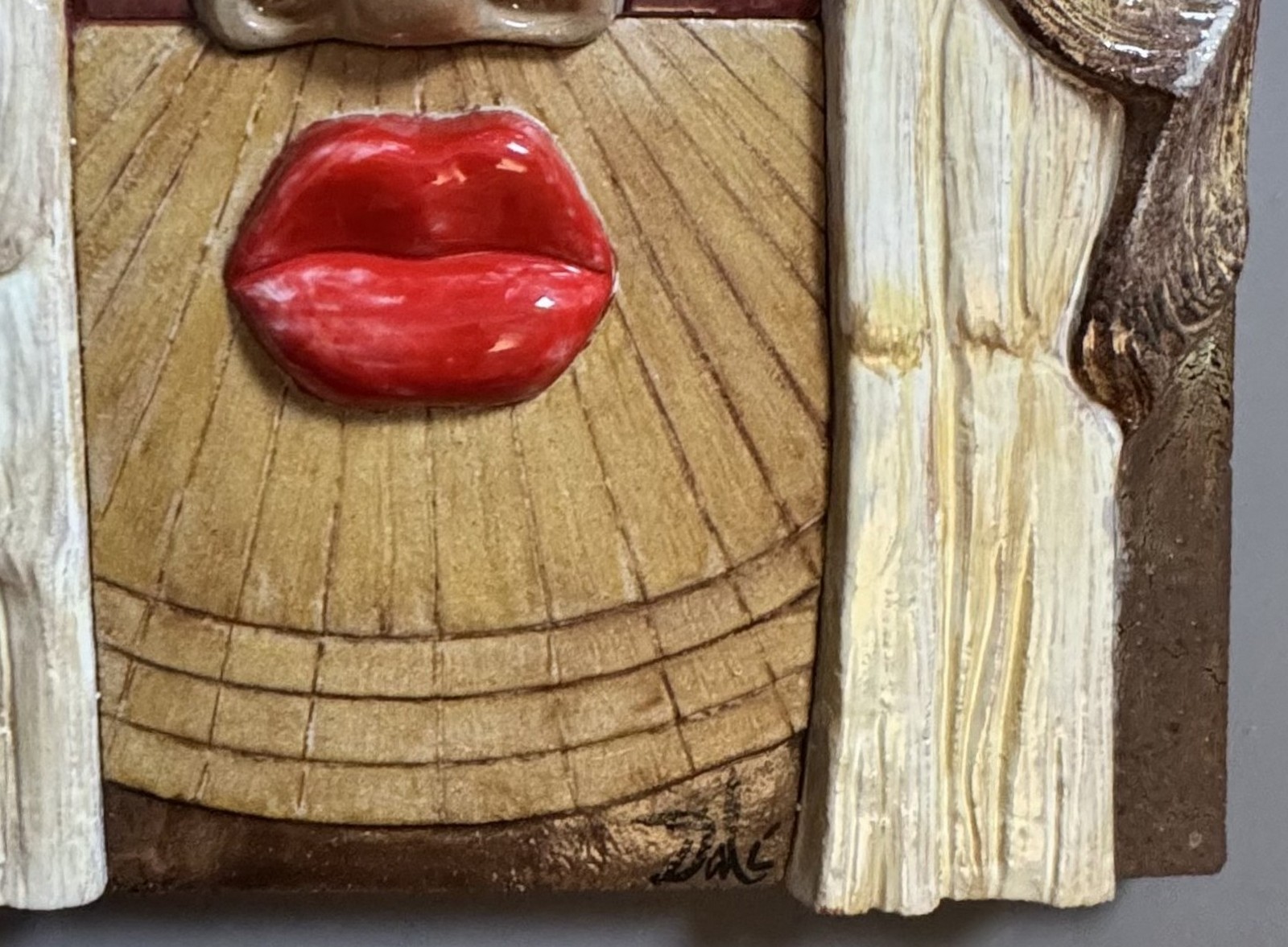 Bas-relief in glazed and painted ceramic, mounted on a wooden panel. Signed "Dalí" lower right.