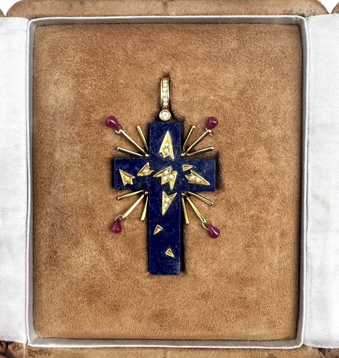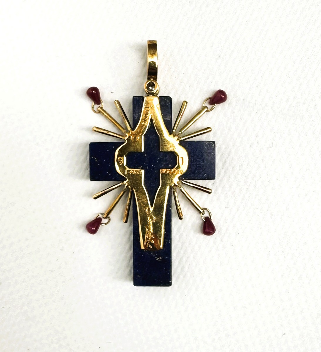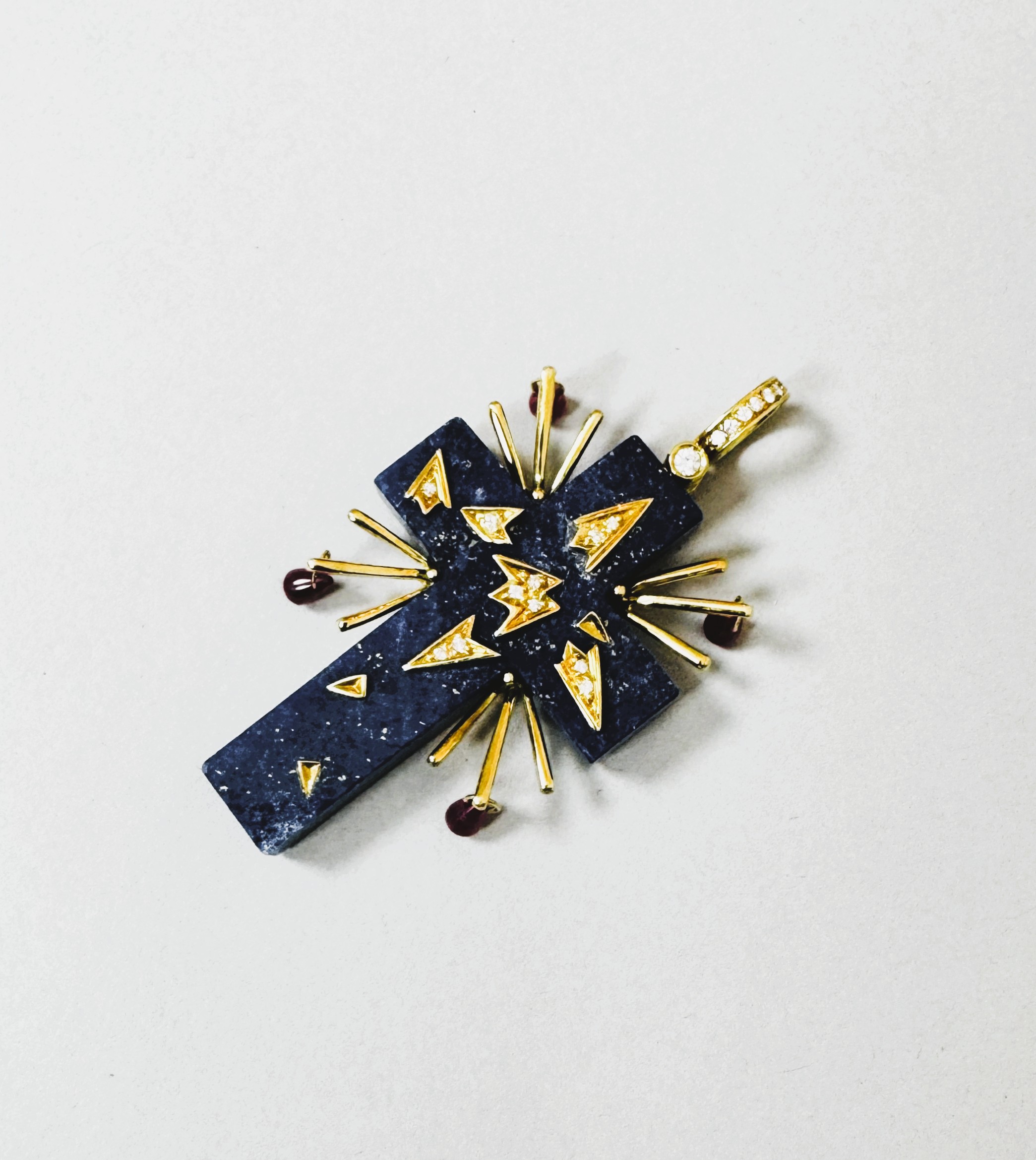 Yellow gold and lapis lazuli pendant. Enhanced with geometric motifs set with round diamonds, the rays supporting small drop-cut rubies. Engraved signature and numbering