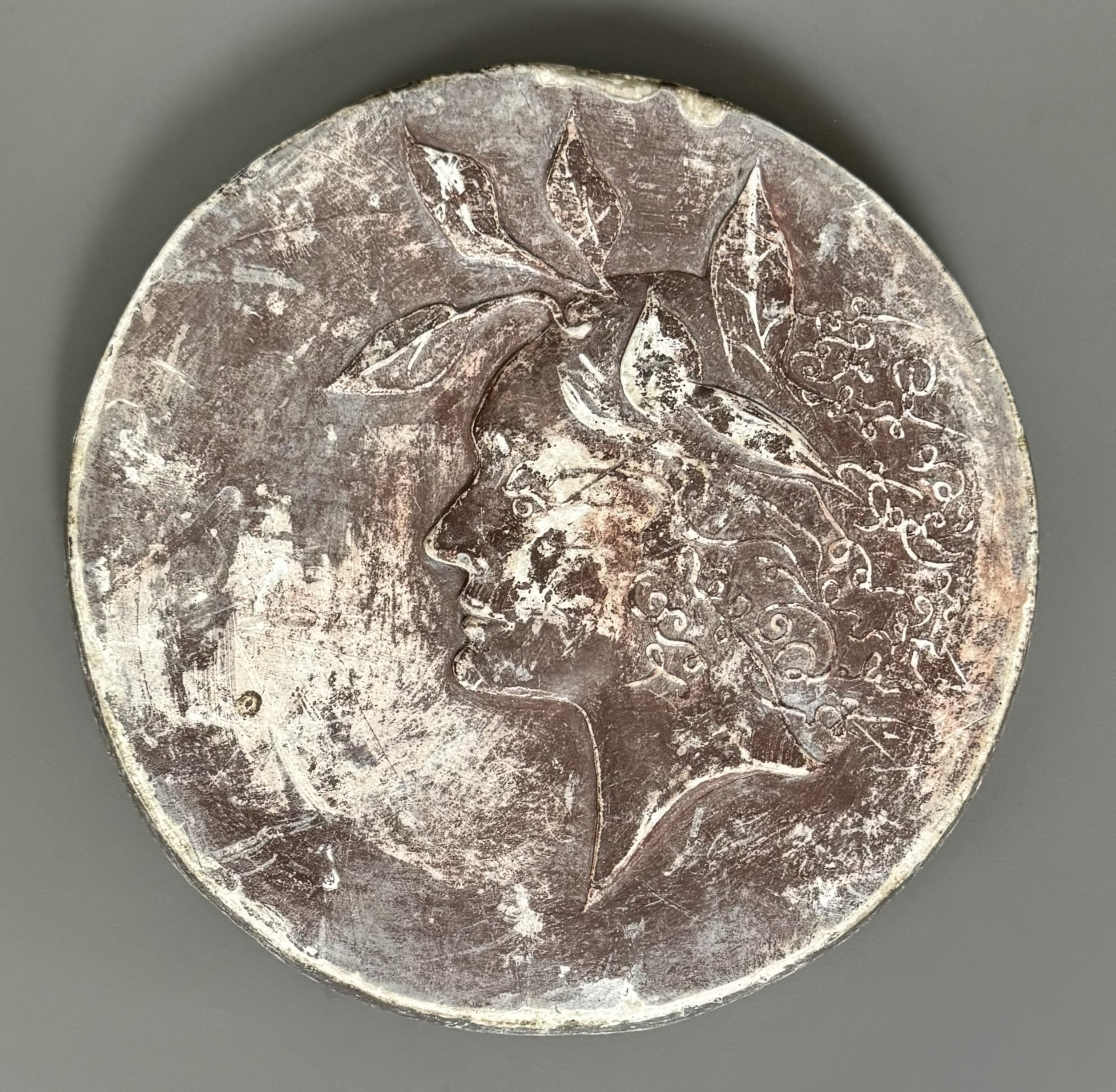 Glazed plaster representing the profile of Gala decorated with leaves in her hair.