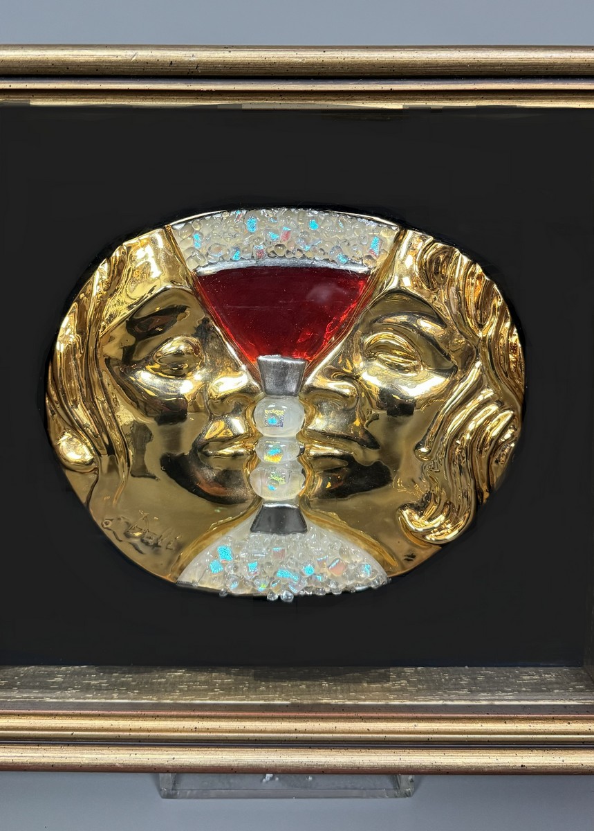 Rare bas-relief in gilded bronze, red-tinted glass, crystals, and silver-plated glass. Signed "Dali" lower right.