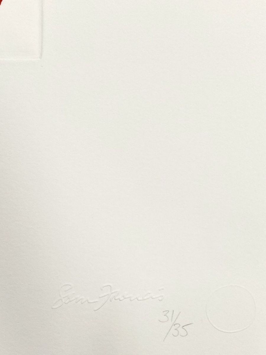 Original color etching on BFK Rives paper, artist's blind stamp signature and "The Sam Francis Estate" ink stamp on the reverse, numbered 31/35. Publisher: The Litho Shop Inc., Santa Monica, 1995. Ref.: SFE-117. Good condition, 53.5 x 46 cm.