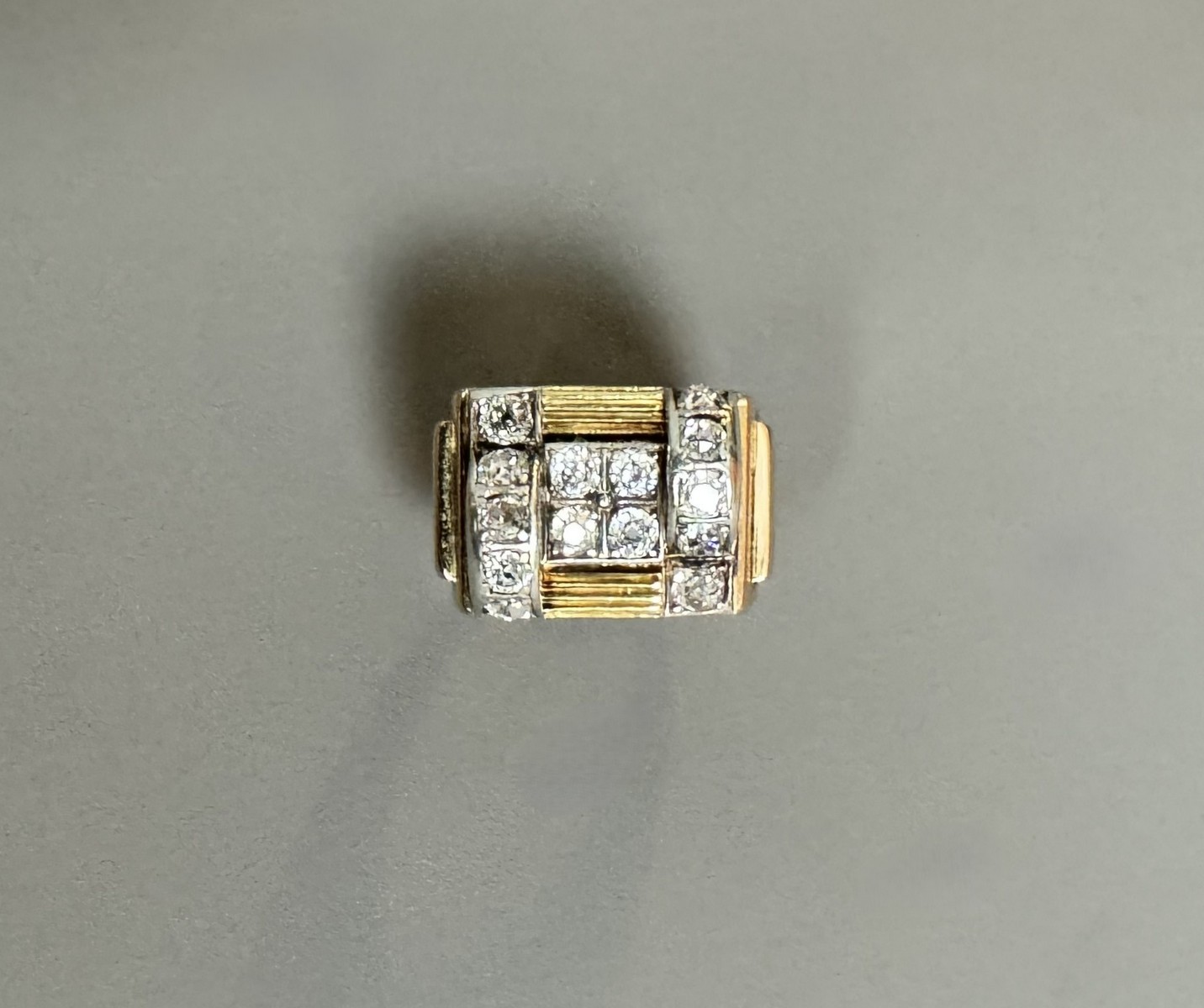 Lot 51 - WORK FROM THE 1940s. TANK RING in 18k (750 thousandths) yellow gold with scroll motifs and old-cut diamonds. TDD.54 – Gross weight: 11 gr.