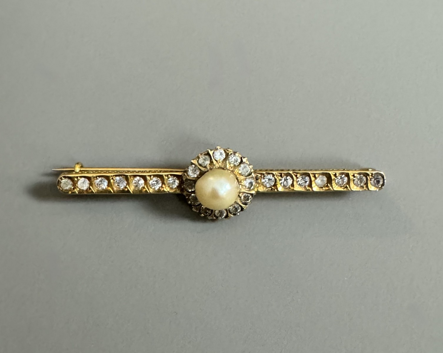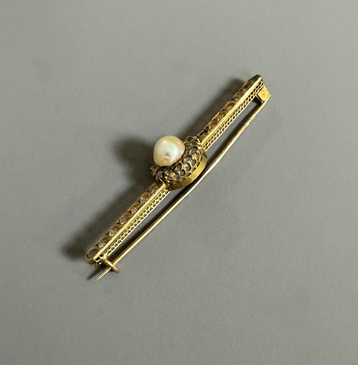 19th CENTURY WORK – 18k (750 thousandths) yellow gold barrette brooch adorned on the central part with a button pearl and old-cut brilliant-cut diamonds, as well as two lines of small old-cut diamonds. Length: 5.3 cm. Gross weight: 4 g.