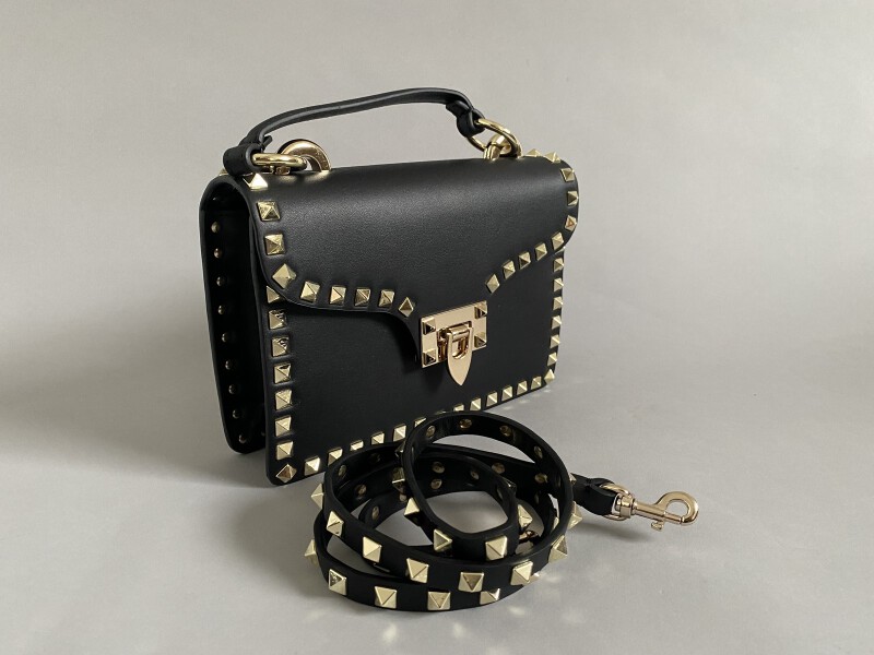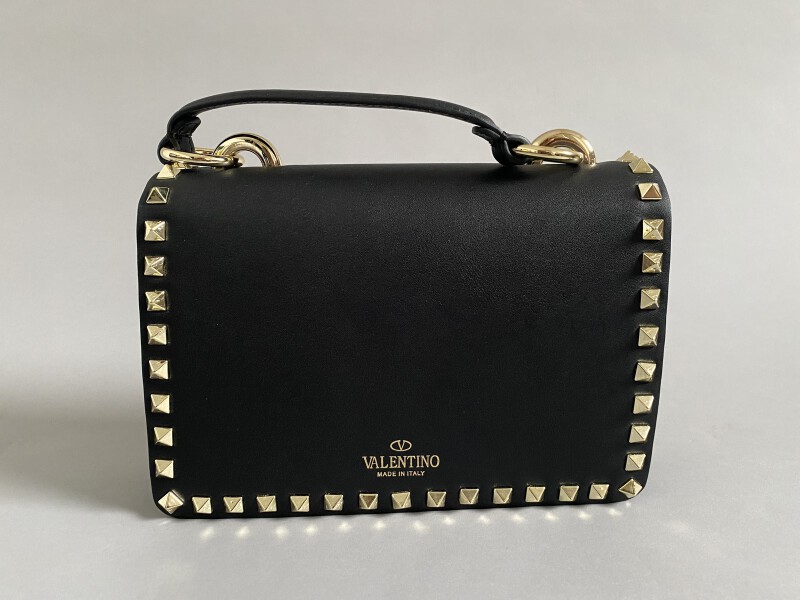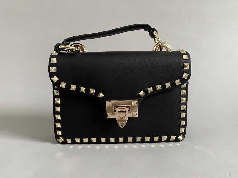 Bag in black leather and gold metal studs. Golden metal shoulder strap. Dust bag.