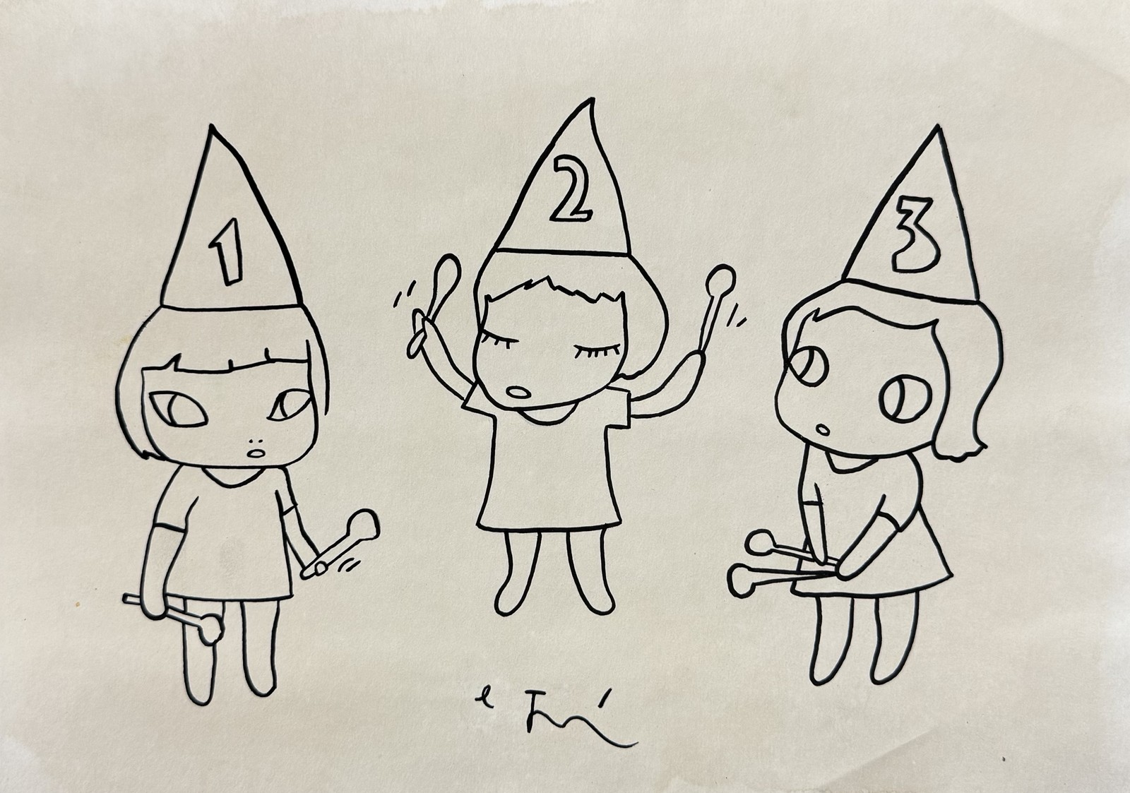 Dessin au feutre noir sur papier représentant trois jeune fille jouant de la musique. Signé en bas au milieu. Tampons au dos de « Dallas Contemporary © Yoshitomo Nara » et celui du « Tate ».
