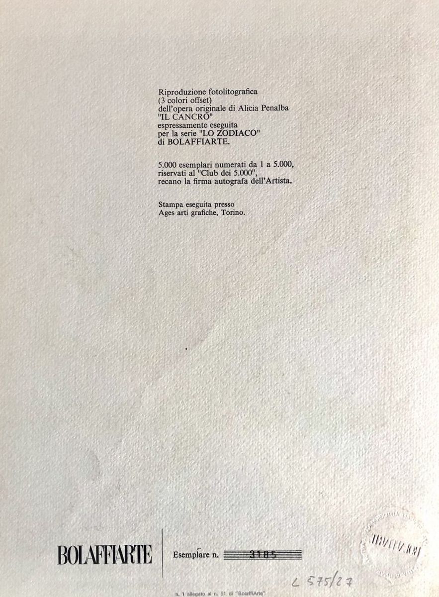 Photolithography on paper, signed in pencil and numbered 3185/5000, publisher’s blind stamp. Publisher: BolaffiArte, Italy, 1975. Edition proof is printed on the back. Good condition, 28 x 21 cm