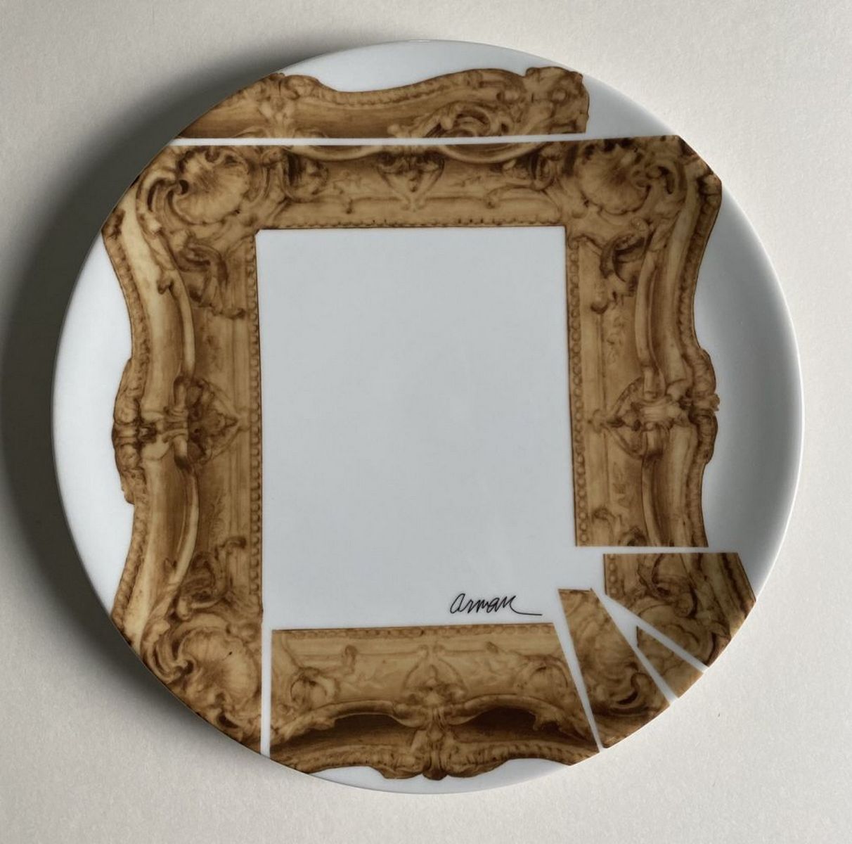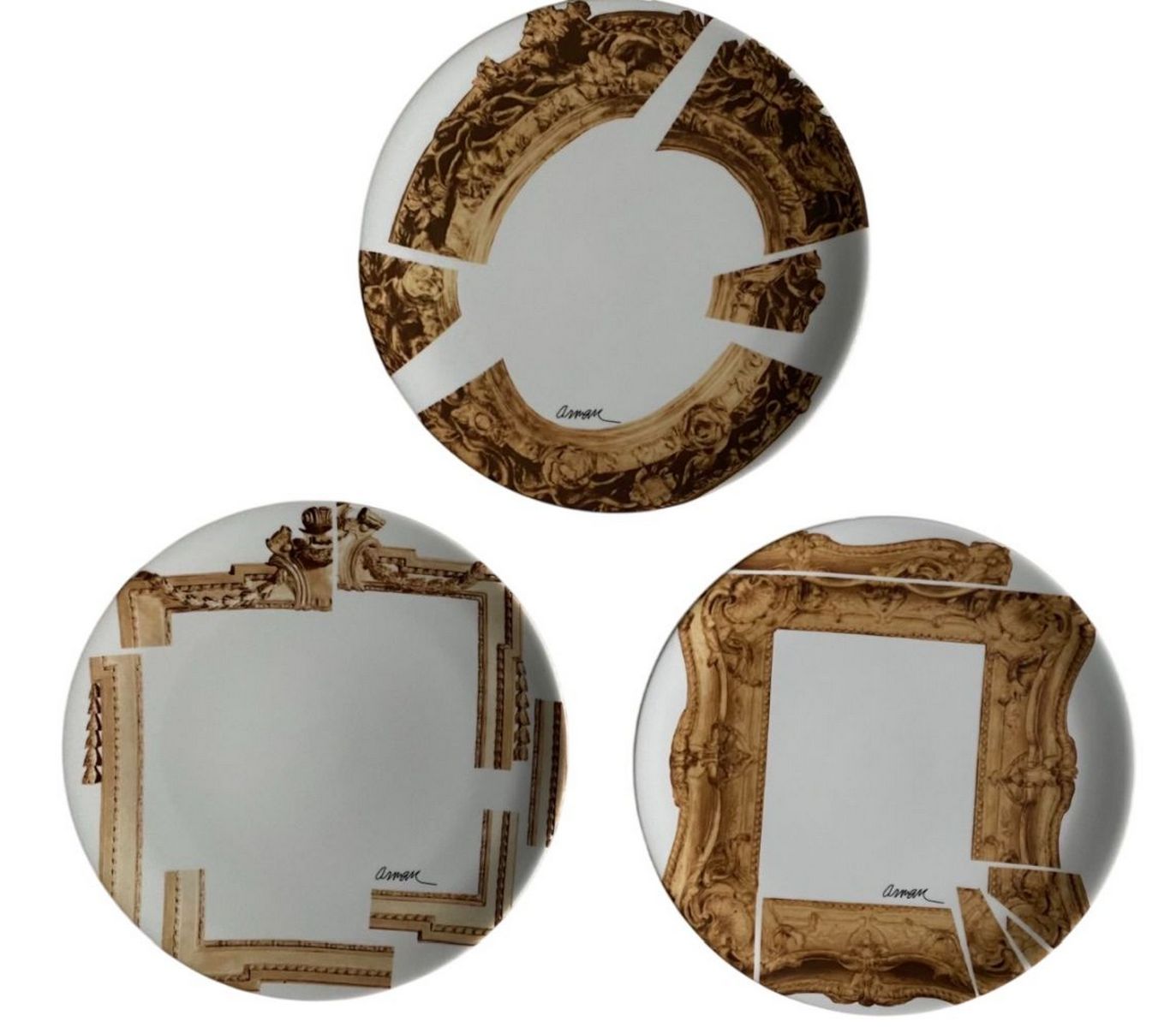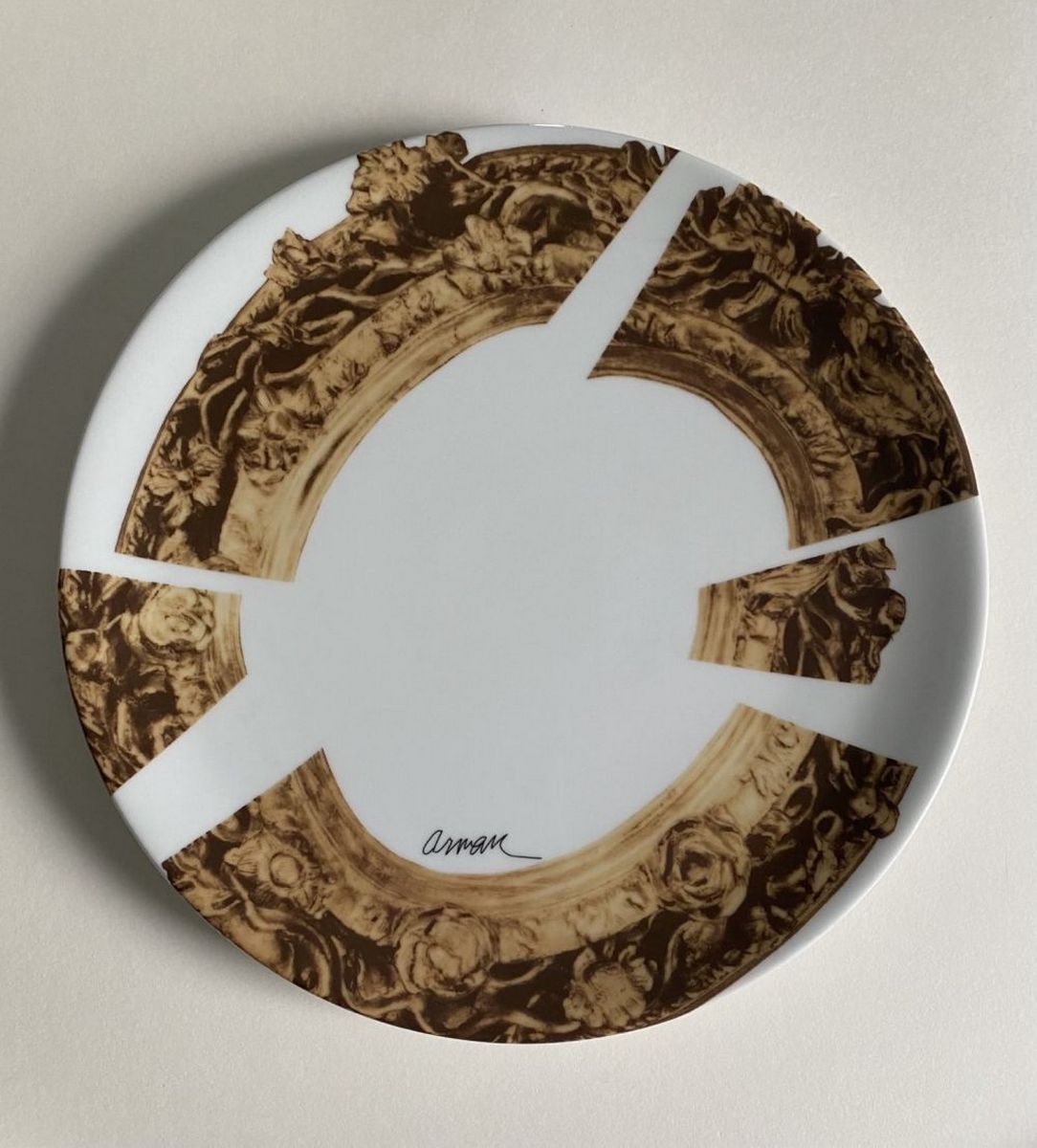Set of 3 Limoges porcelain plates featuring Arman’s interpretation of the three French decorative styles: Louis XIII, Transition Louis XV-Louis XVI, and Louis XVI. Signed in plate, numbered on the back /1000. Good condition, 27.5 cm diameter.