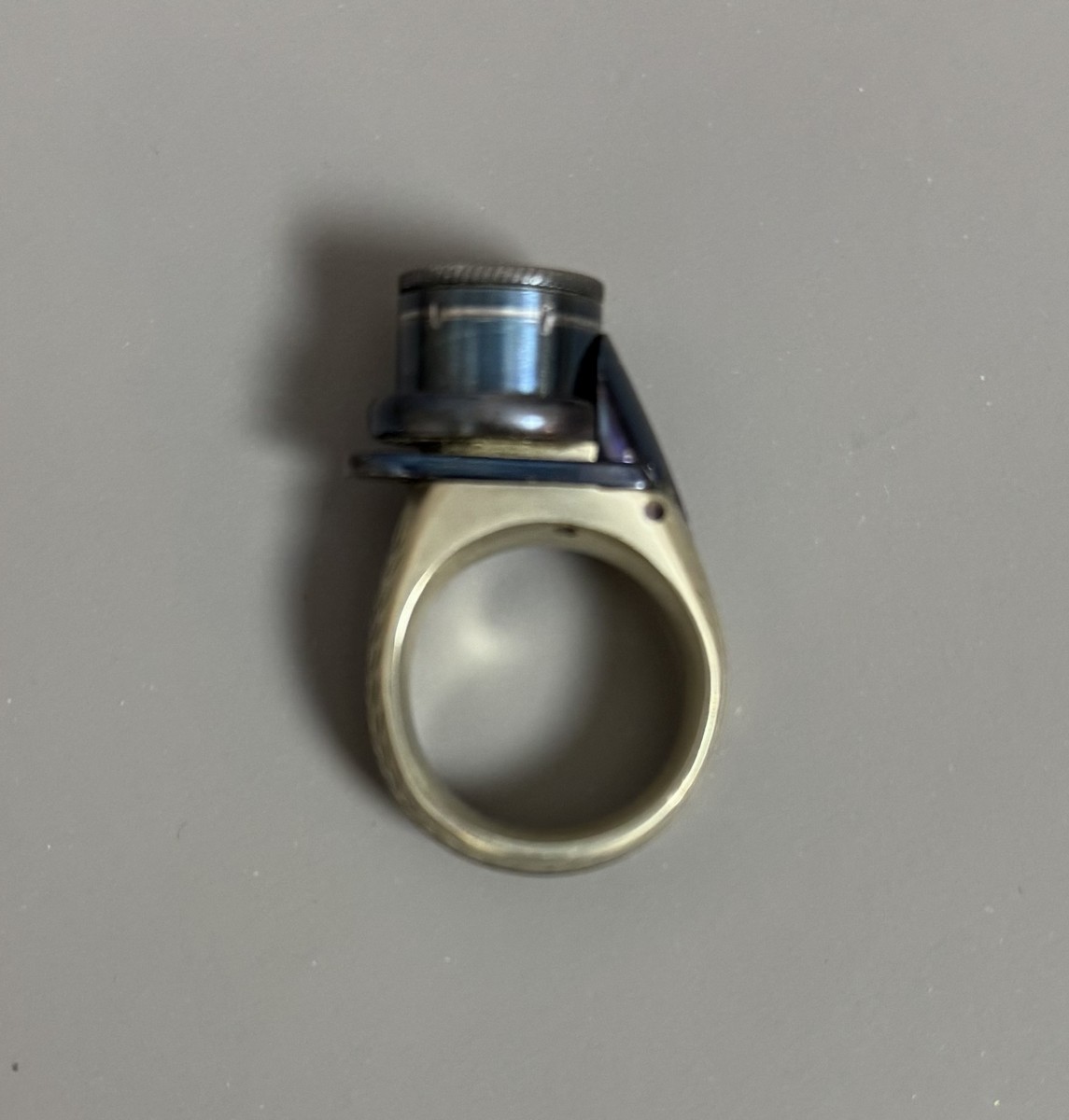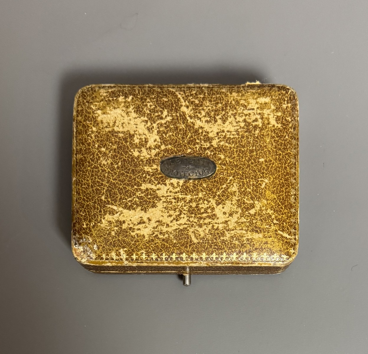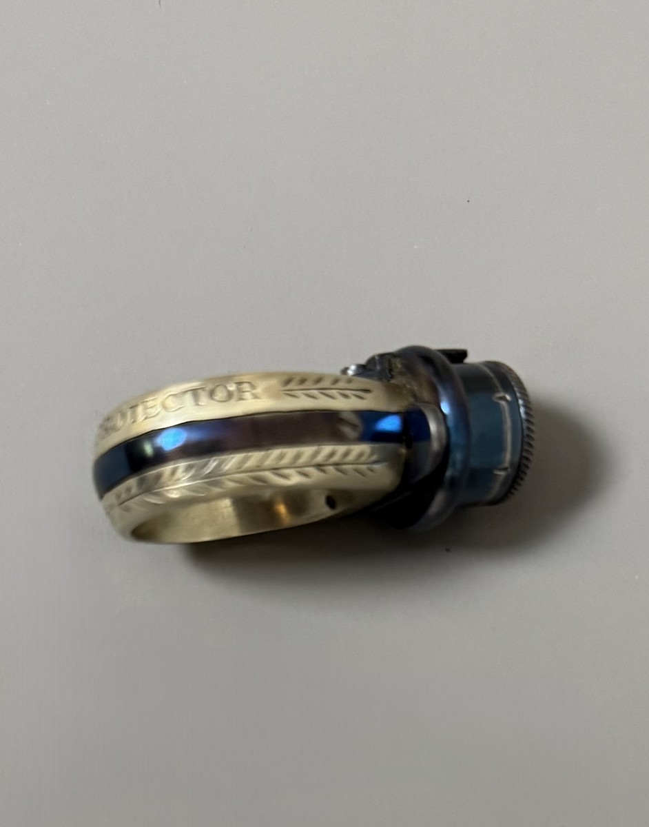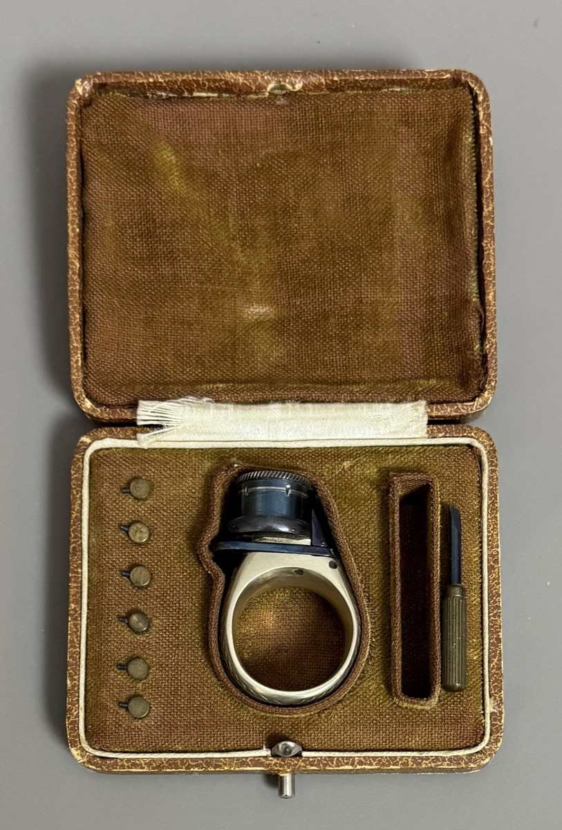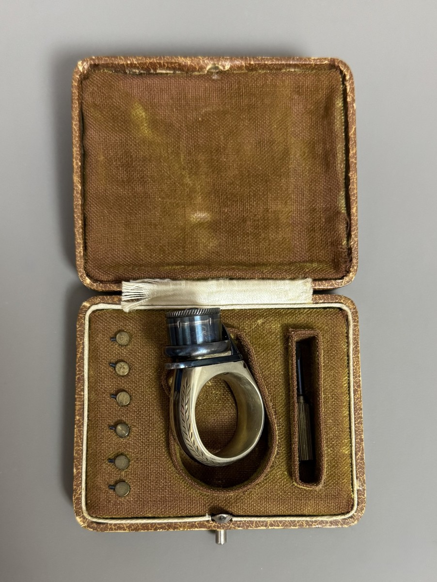 Lot 26 - BAGUE RÉVOLVER, « le petit Protector », à broche, 6 coups, calibre 4 mm. Barillet bleu, guilloché sur le bord pour être tourné à la main. Détente latérale. Anneau en maillechort gravé de feuillages et marqué « LE PETIT PROTECTOR » XXe siècle. Dans son coffret en cuir décoré au petit fer, avec plaque en argent gravée « Le petit protector », garni à l’intérieur de velours. Avec sa boîte d’origine (6,7 x 8,2 , 2 cm) , 6 balles de plomb et un tournevis. Complet.