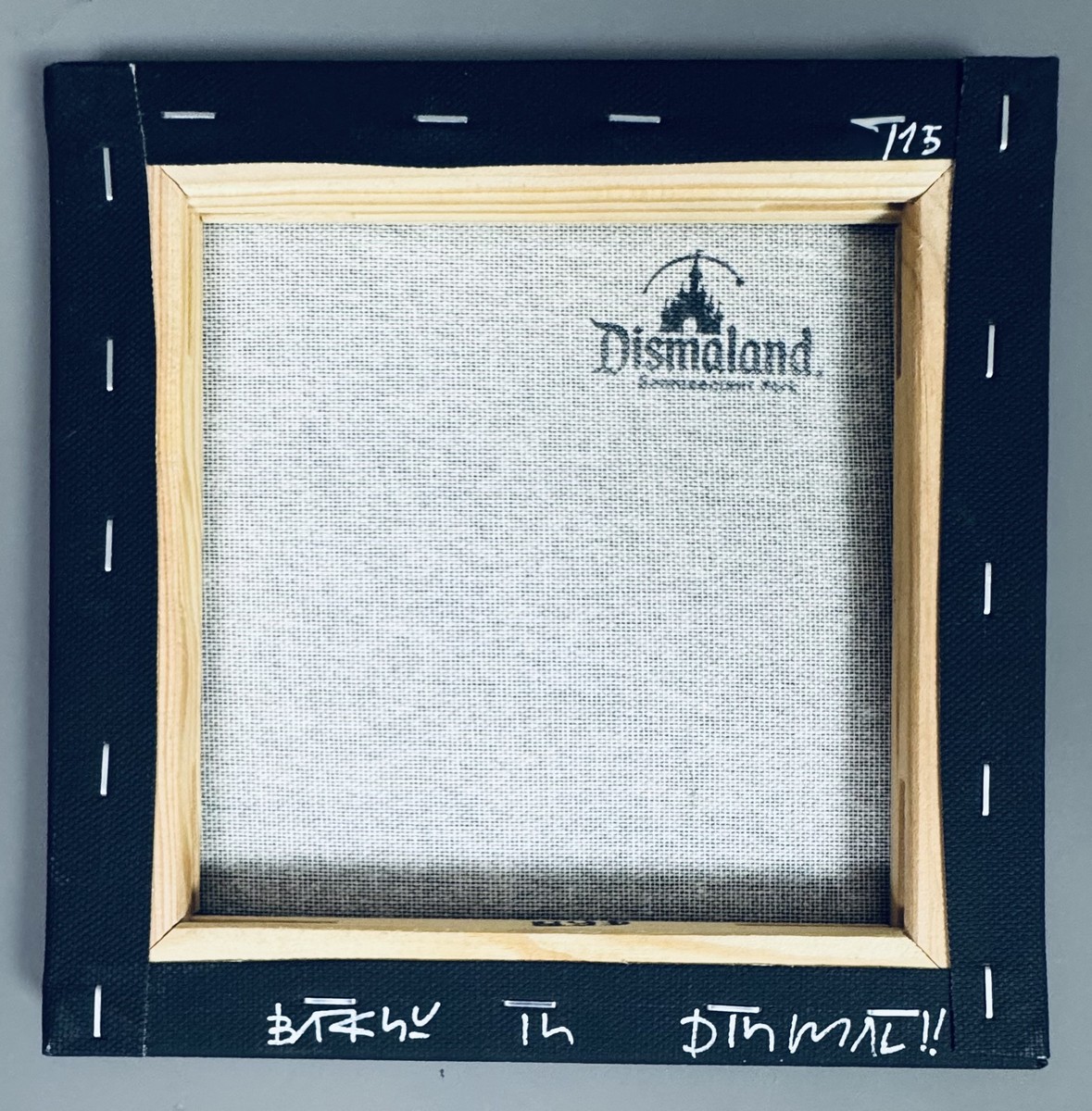 Souvenir de Dismaland. Pochoir original en blanc et bleu sur toile noir. Signée « Banksy » sur la tranche à gauche. Numérotée 1/2. porte la mention « BANKSY IS DISMAL » avec tampon de Dismaland.