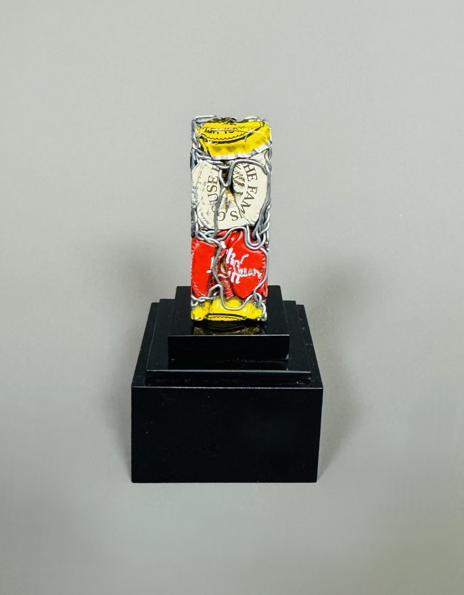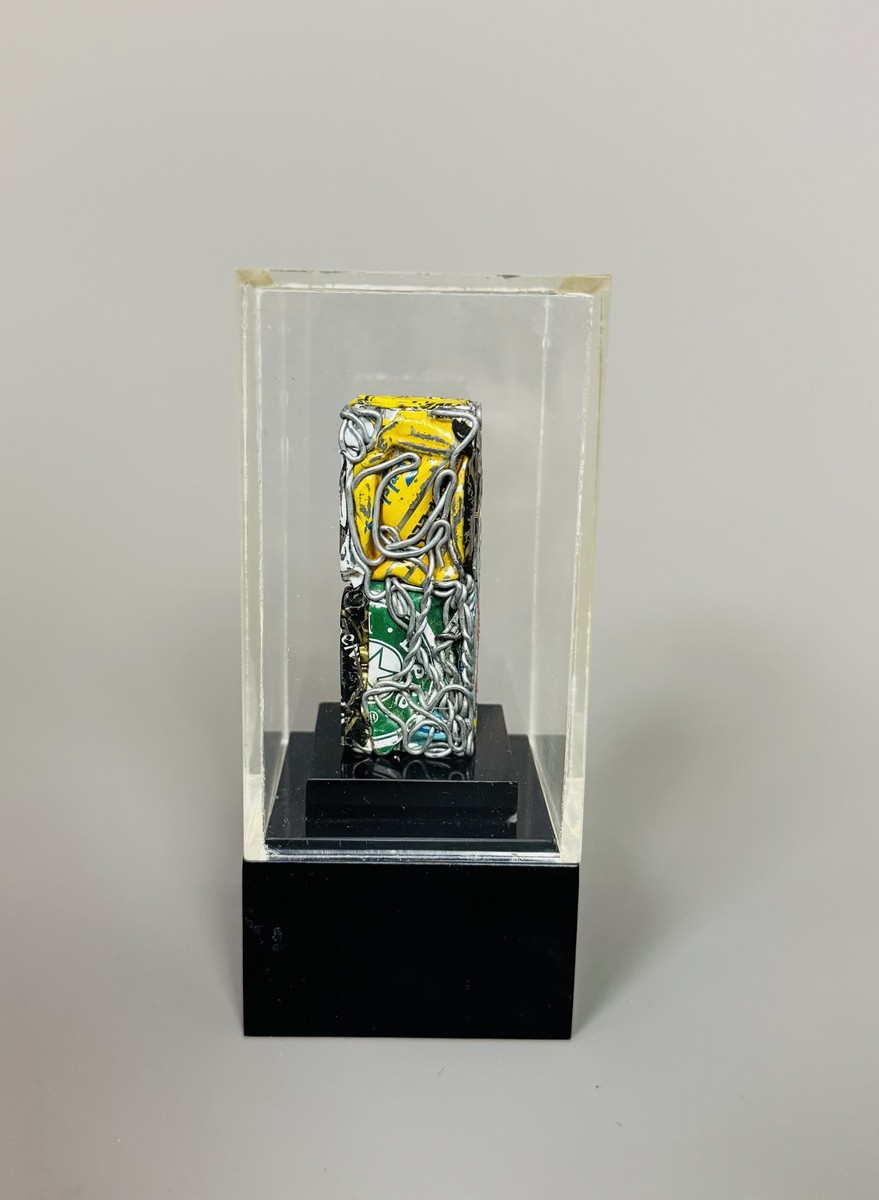 Pendentif en métal et alliage sous un emboîtage en plexiglass. Signé « César » en creux par l’artiste. Dimensions de la compression : 6 x 2,1 x 2,3 cm. Un Un rare certificat d’authenticité signé par César et daté de 1994 accompagne l’œuvre.