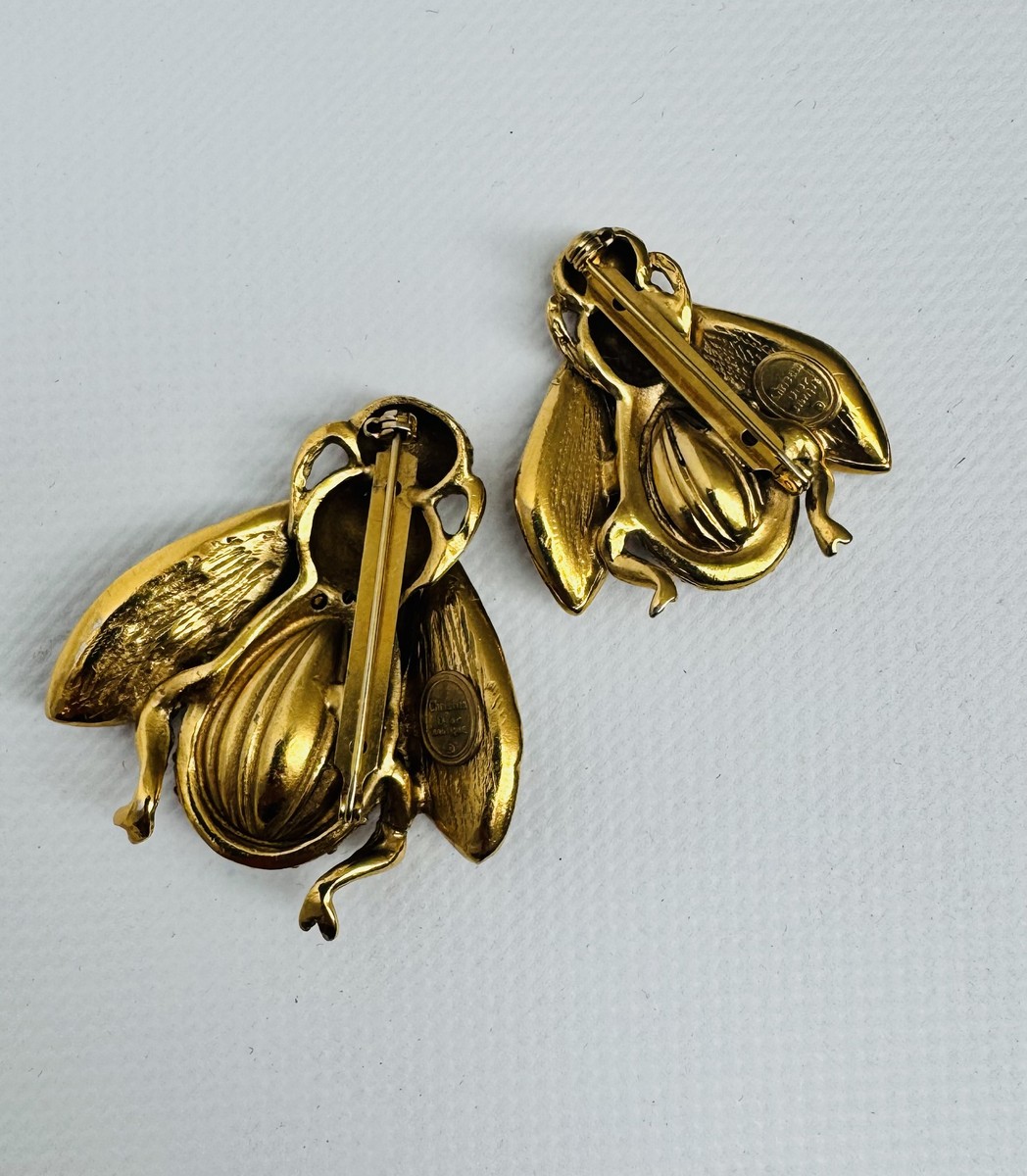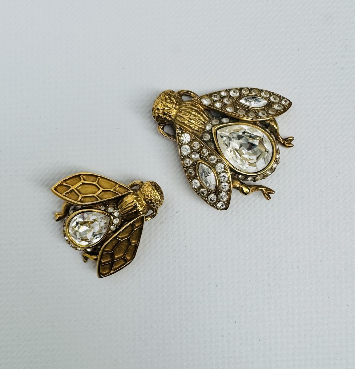 Lot 7 - CHRISTIAN DIOR -Deux broches en métal doré et strass figurant une petite et une grande abeille. Signé.4,8 x 4,5 cm – 3,8 x 3,6 cm