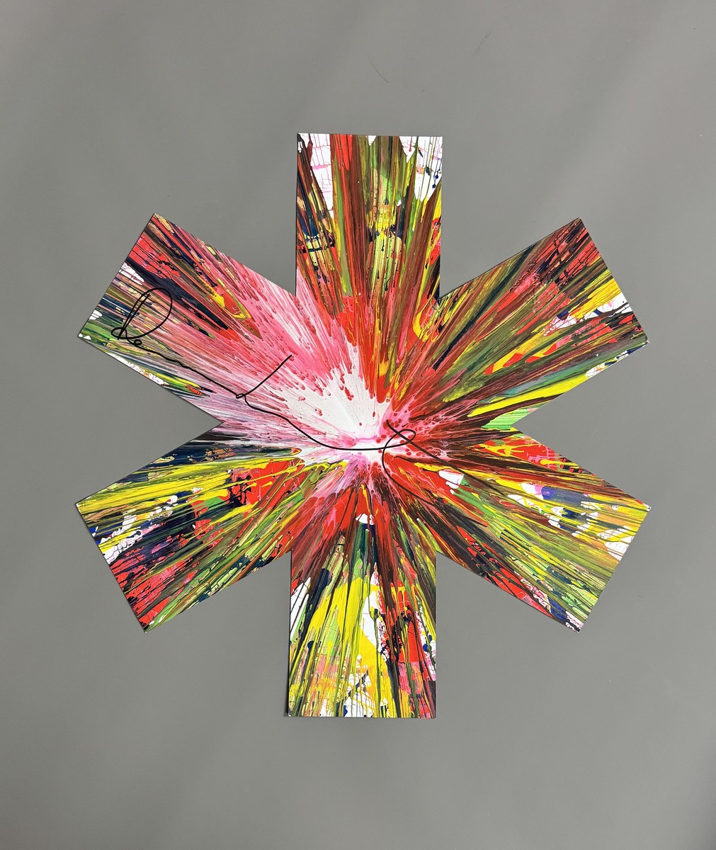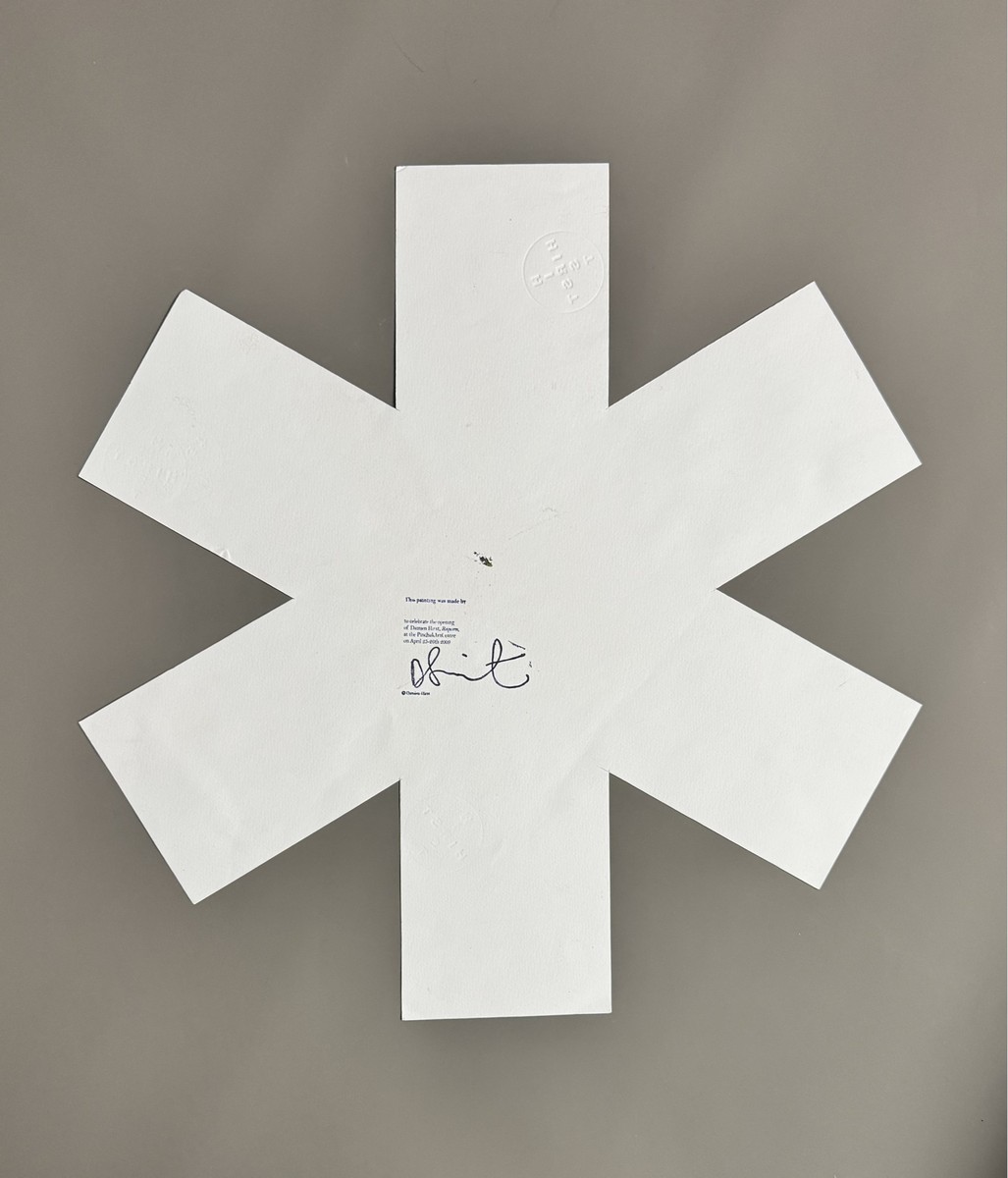 Acrylique sur papier découpé, signé et contresigné au dos du cachet de l’artiste et du timbre à sec ‘Hirst’, daté, avec la mention « This painting was made by / to celebrate the opening / of Damien Hirst, Requiem, / at the Pinchuk Art Centre » au dos.
