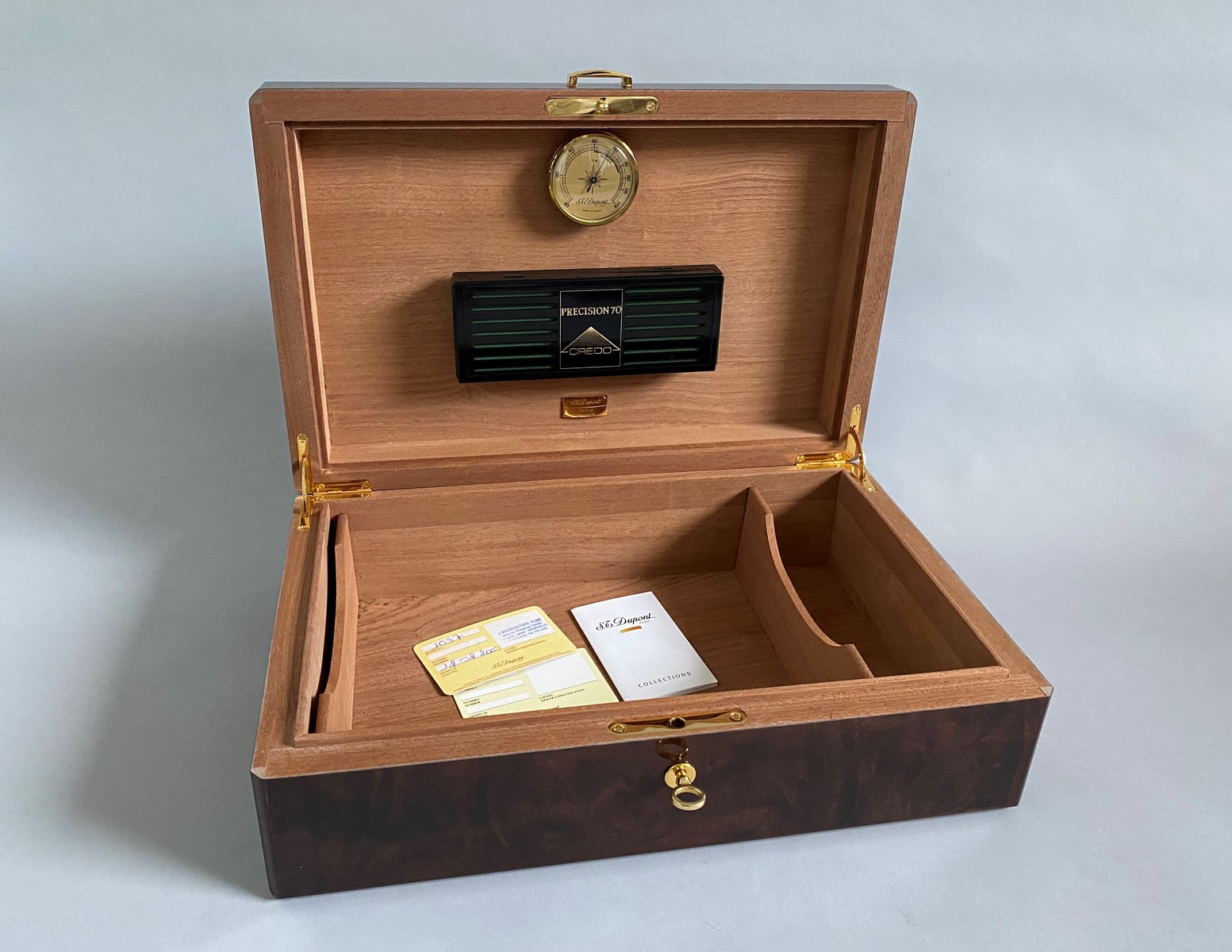Très belle cave à cigares de voyage en bois laqué, le couvercle à hygromètre et humidificateur appliqués. Etat neuf. Accompagné du certificat.