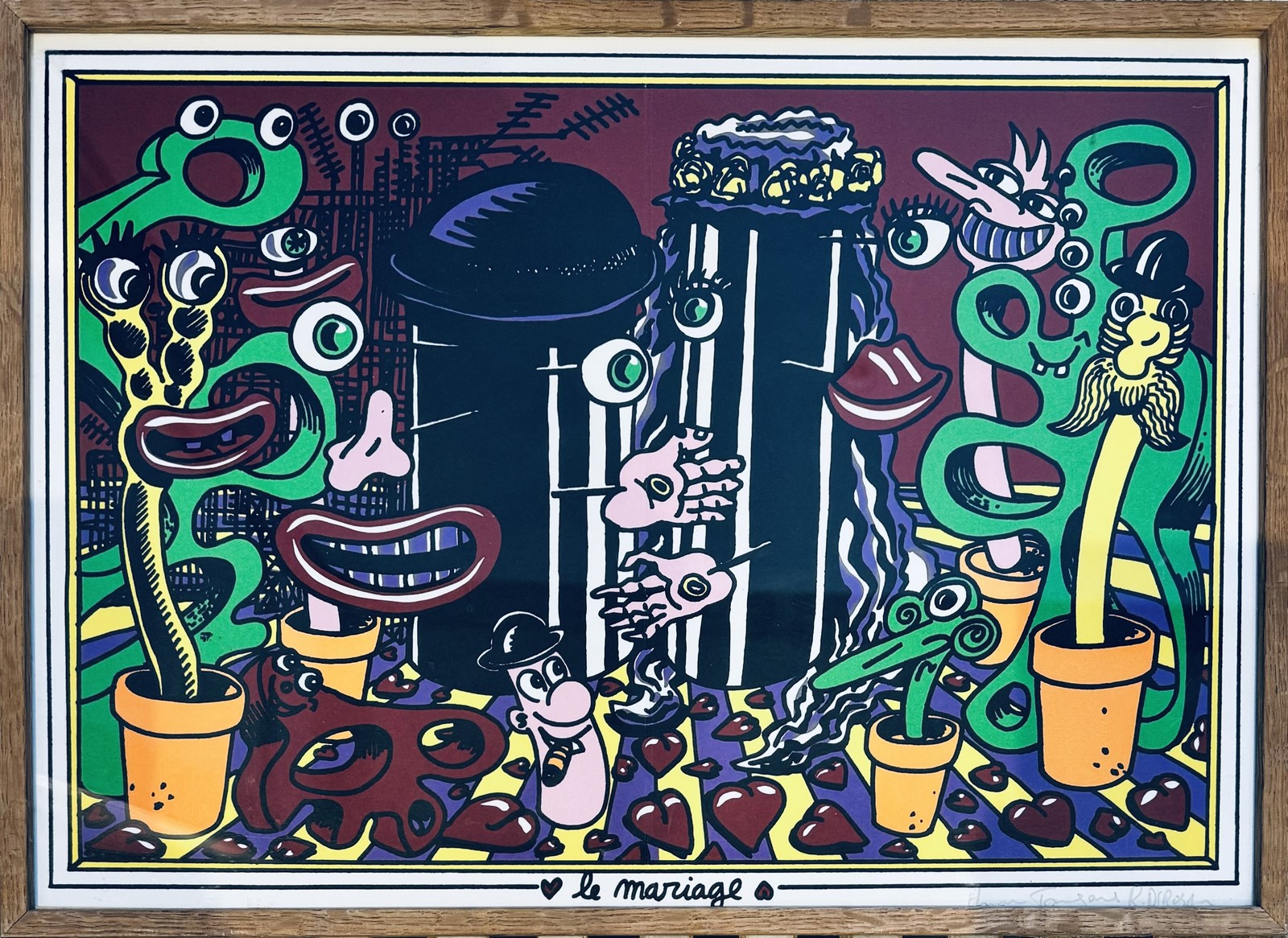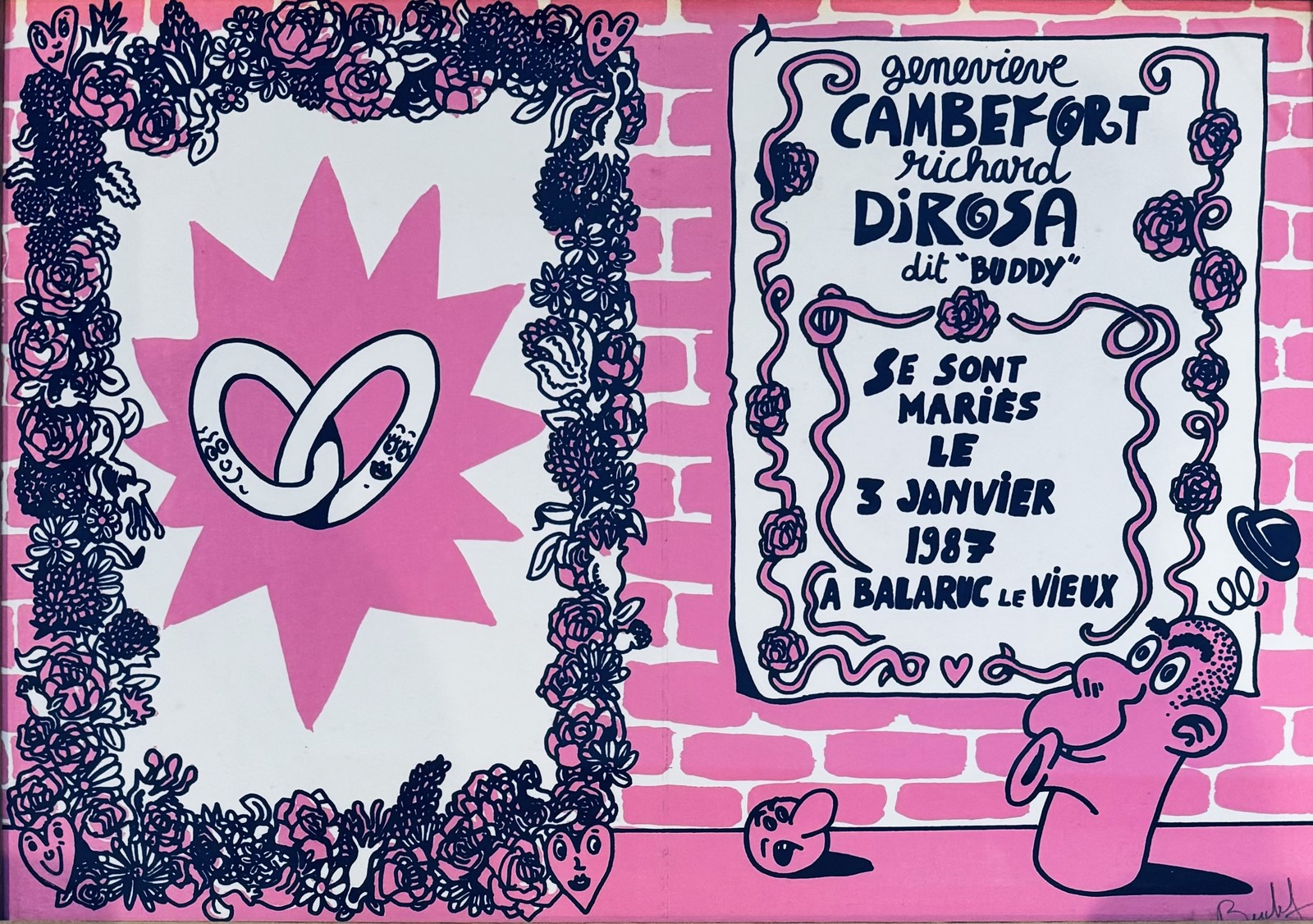 Rare lithographie ayant servie de carton d’invitation et éditée à l’occasion du mariage de Richard Di Rosa dit « Buddy » et Geneviève Cambefort , le 3 janvier 1987.
