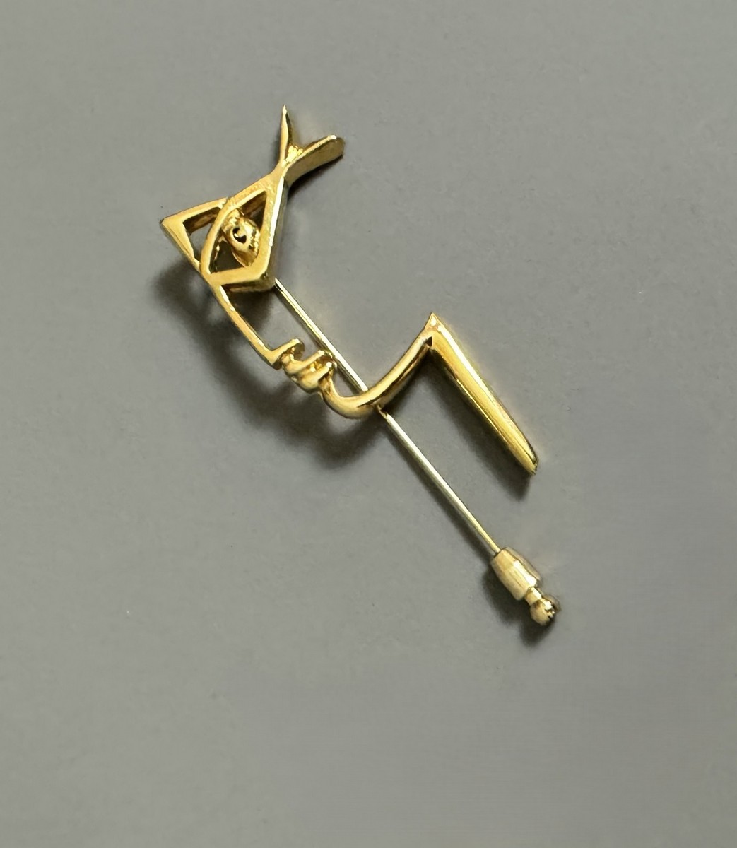 Épingle en métal doré, figurant un profil et émail noir. Signée « Jean Cocteau » sur la tranche. Dimensions : 7,1 x 2,6 cm environ.