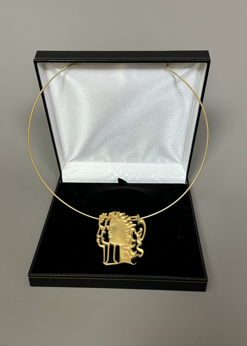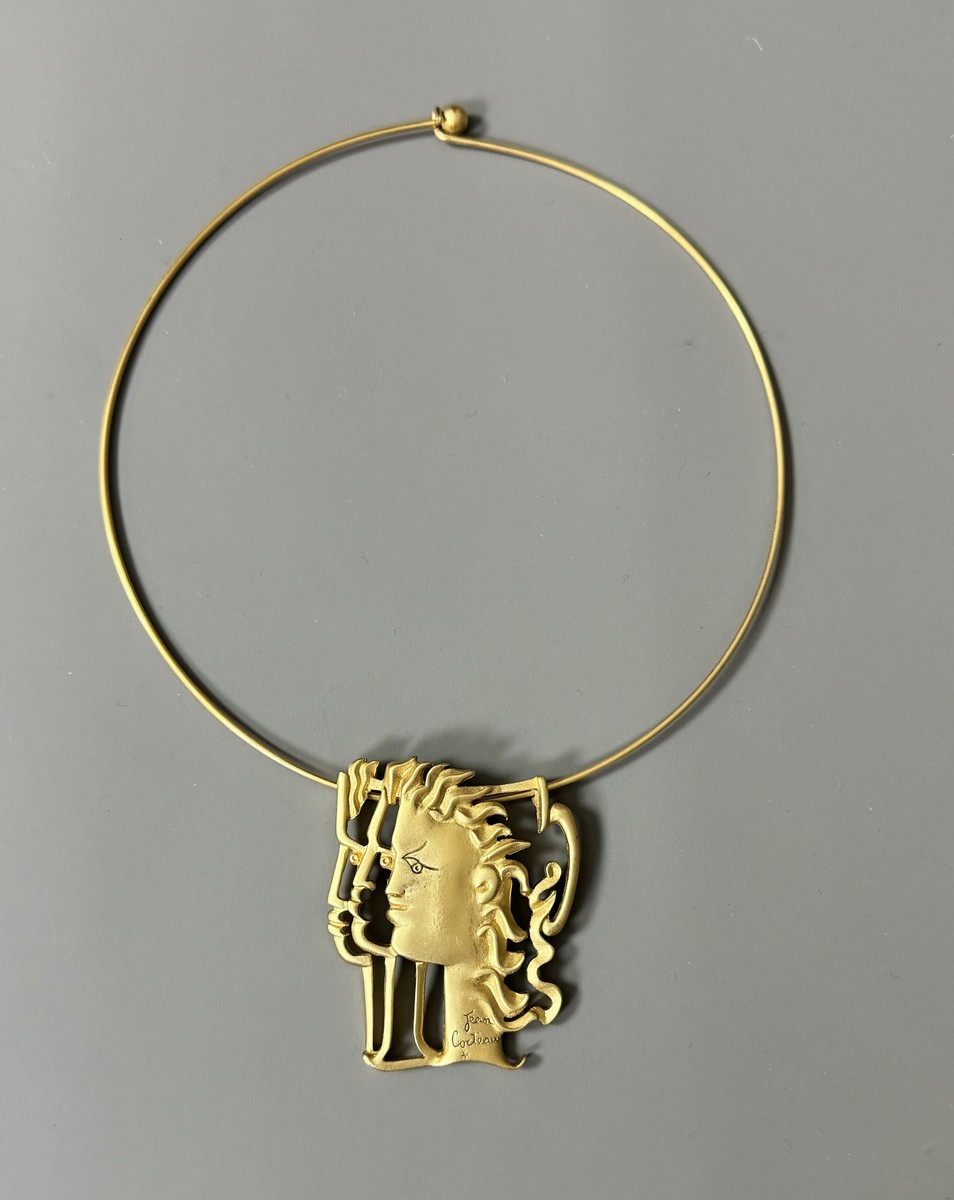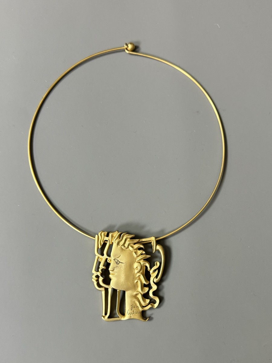 Pendentif en métal doré, tour de cou rigide. Signé « Jean Cocteau » sur le devant. Numéroté 275/300 au dos.