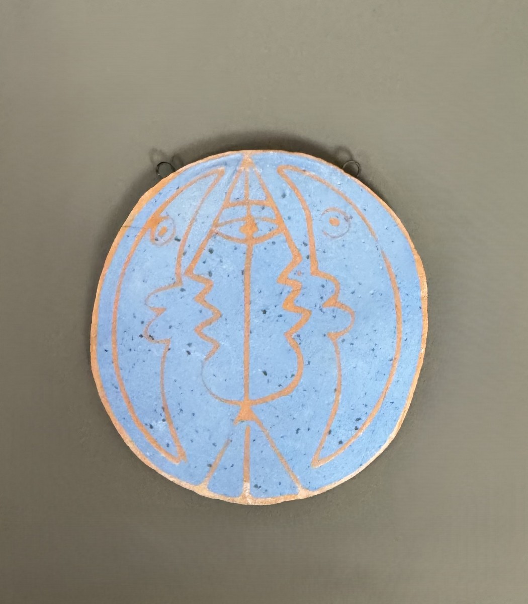 Pendentif oval constitué d’une plaque découpée de céramique de terre rose figurant un visage stylisé incrustée bleu. Signé « Jean Cocteau » au dos.