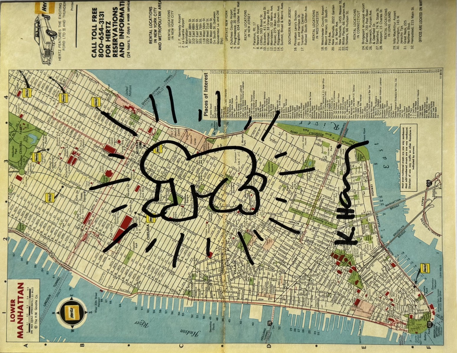 Dessin au marqueur sur plan dépliant de New-York Manhattan, signé. Au dos cachet ‘Authorized by The Estate of Keith Haring’