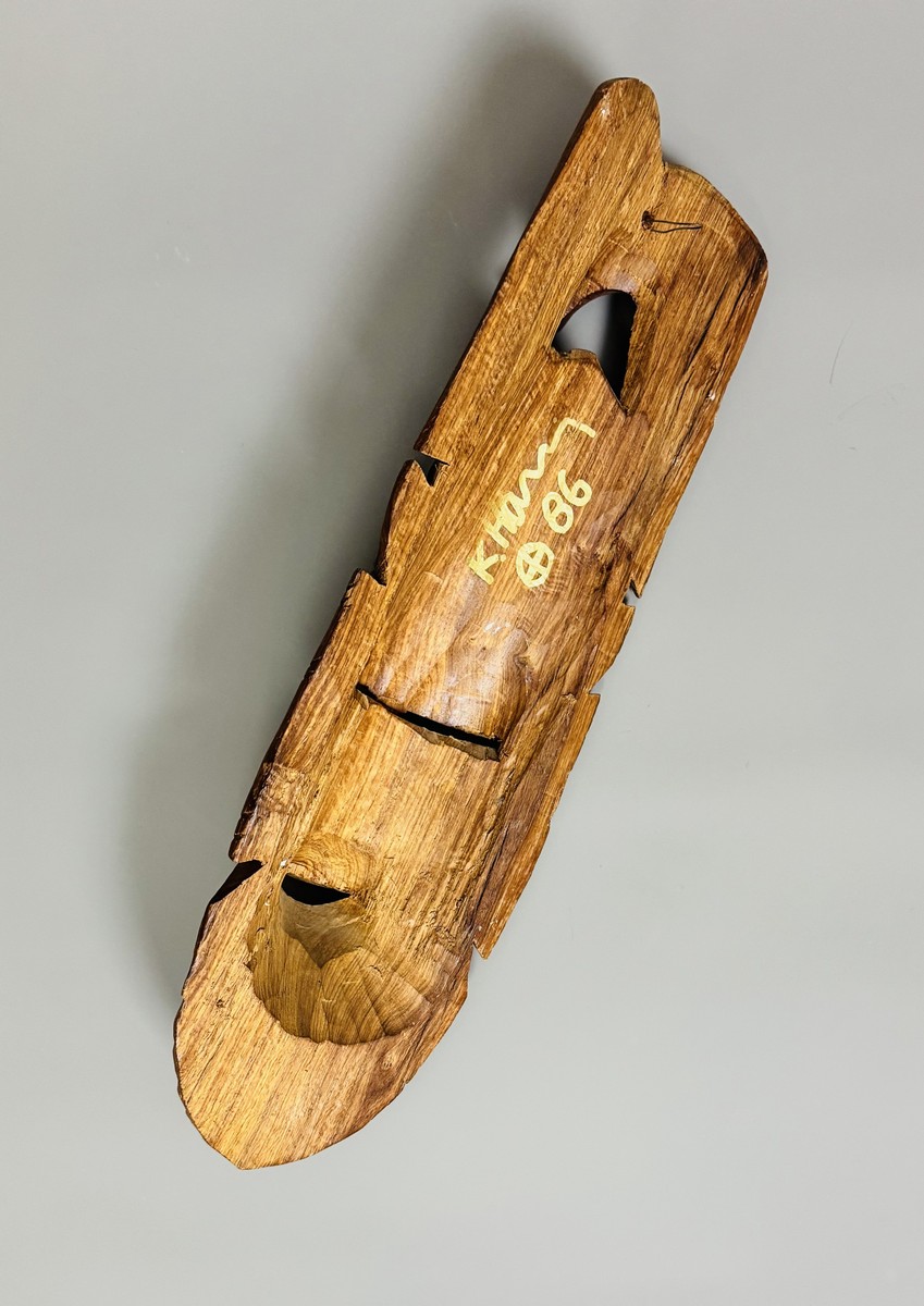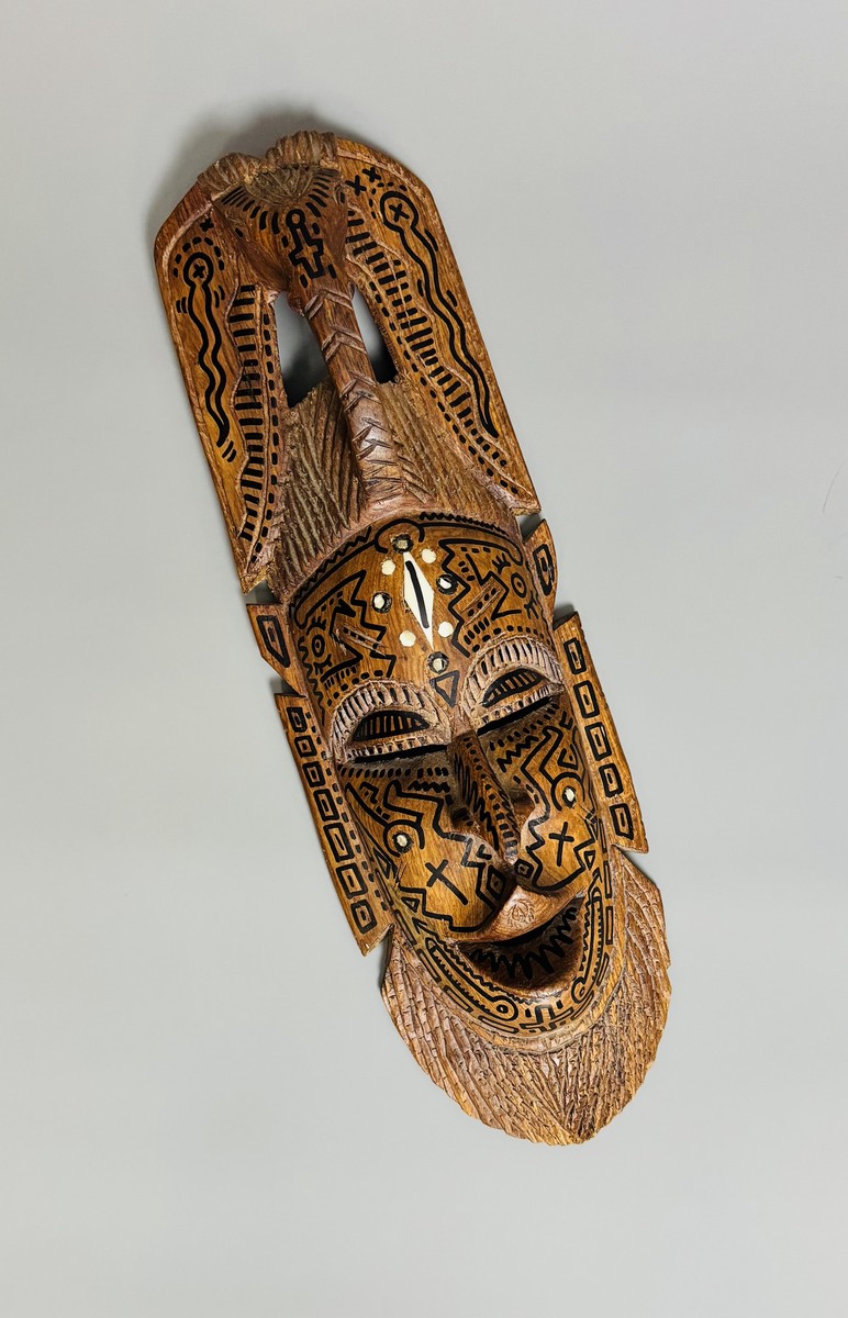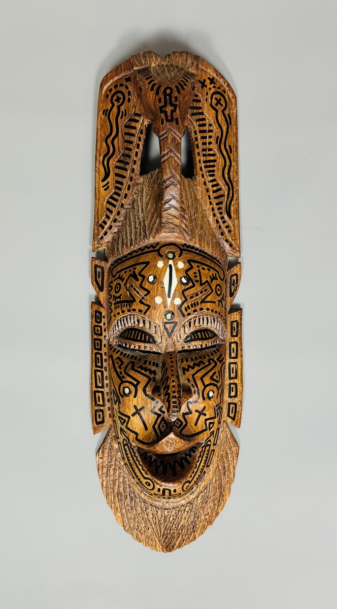 Dessin au marqueur sur masque africain en bois.