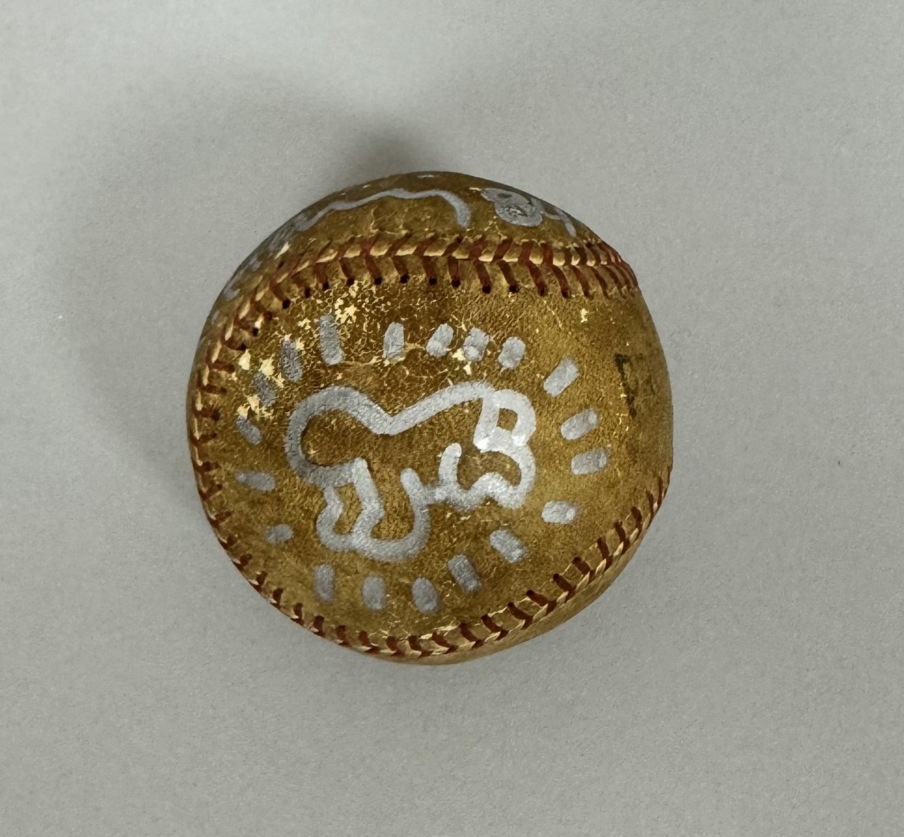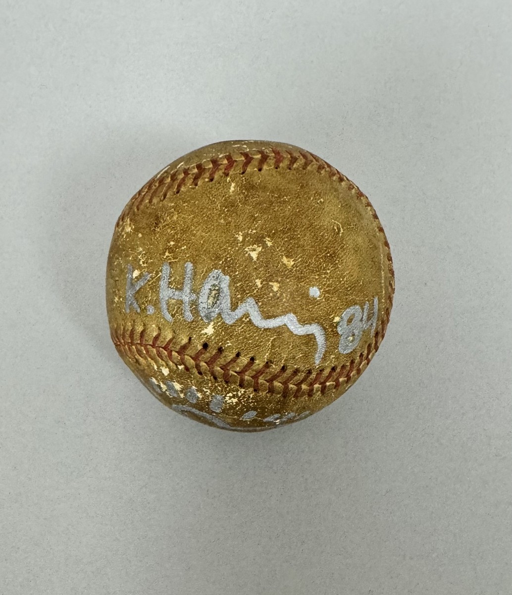 Dessin original au marqueur argenté sur balle de baseball. Signé et daté « 84 ».
