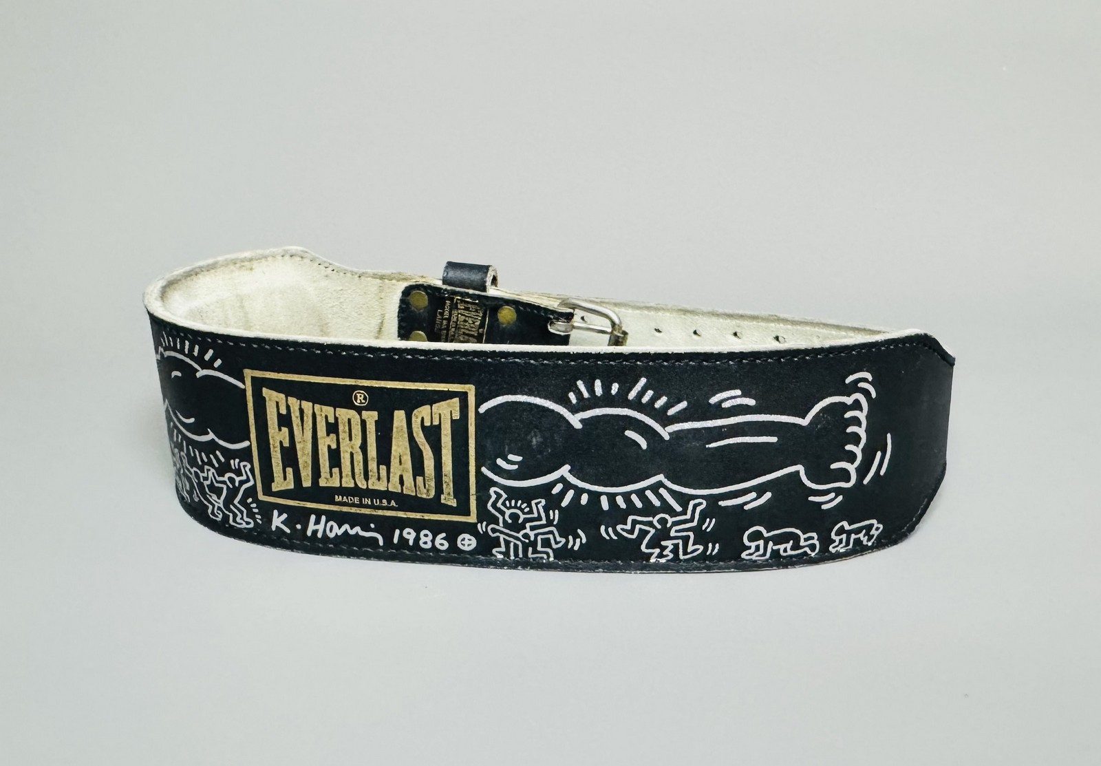 Dessin original au marqueur blanc sur ceinture de boxe en cuir Everlast. Signé et daté « 86 ».