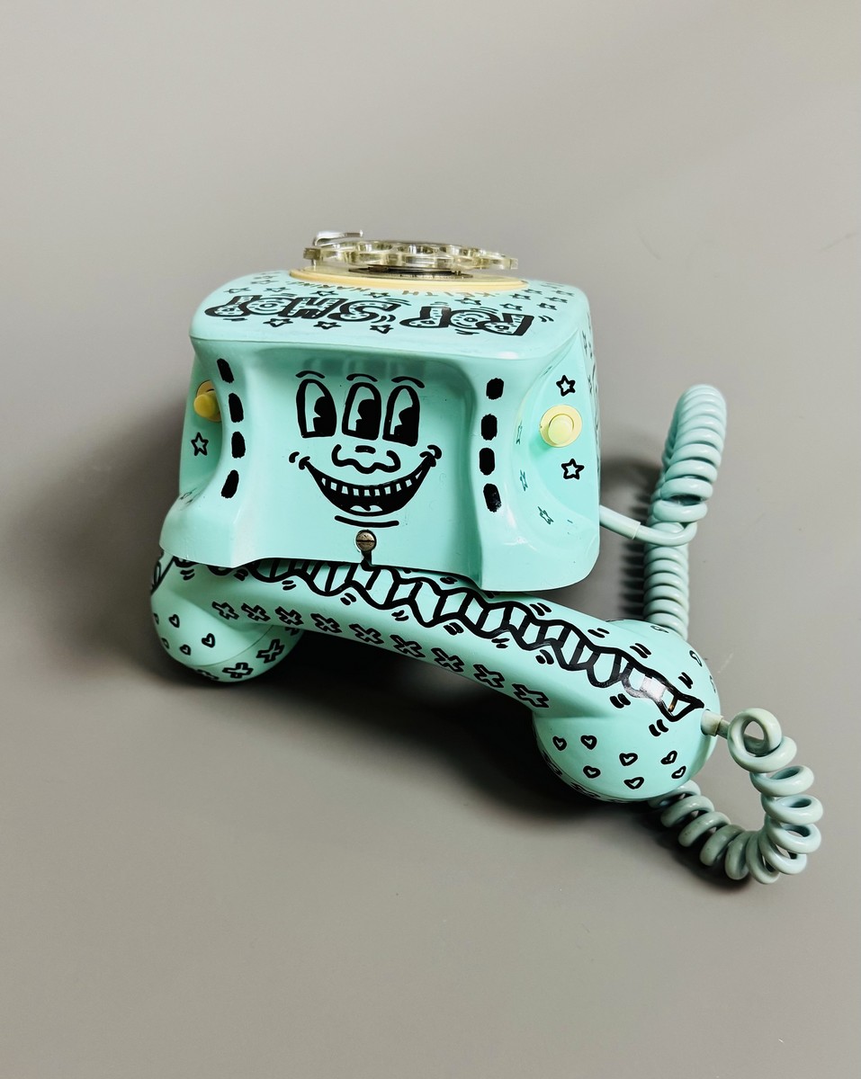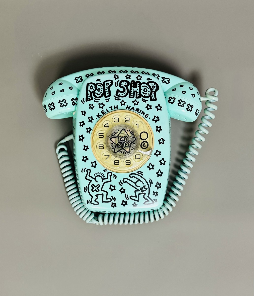 Dessins à la peinture et marqueur noir sur téléphone à cadran rotatif en métal et plastique, entièrement peint. Signé et daté sous la base. Annoté « Pop Shop » et « Keith Haring ».