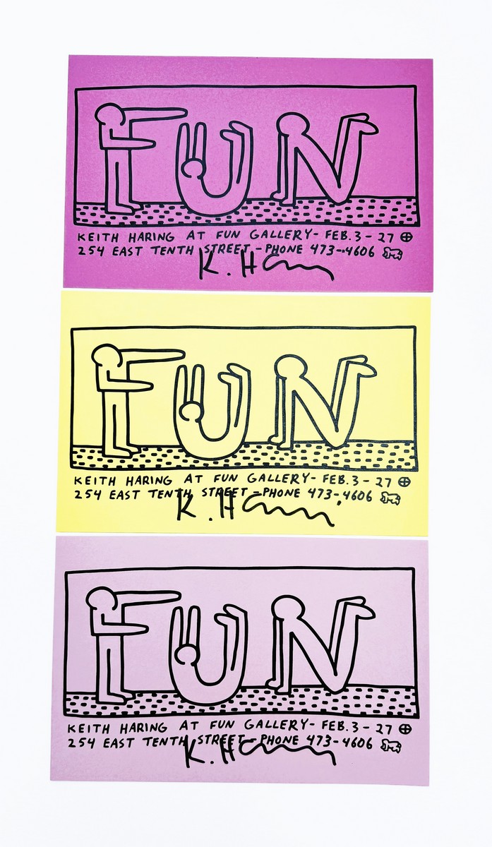 Ensemble de trois invitations sérigraphiées sur papier, pour l’exposition ‘Keith Haring at Fun Gallery, Février 3-27’. Chacune signée au marqueur.