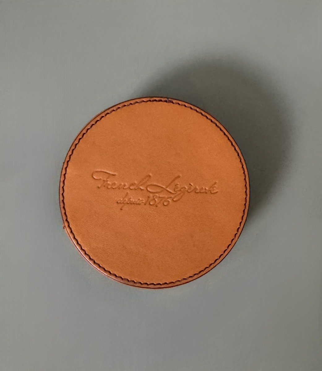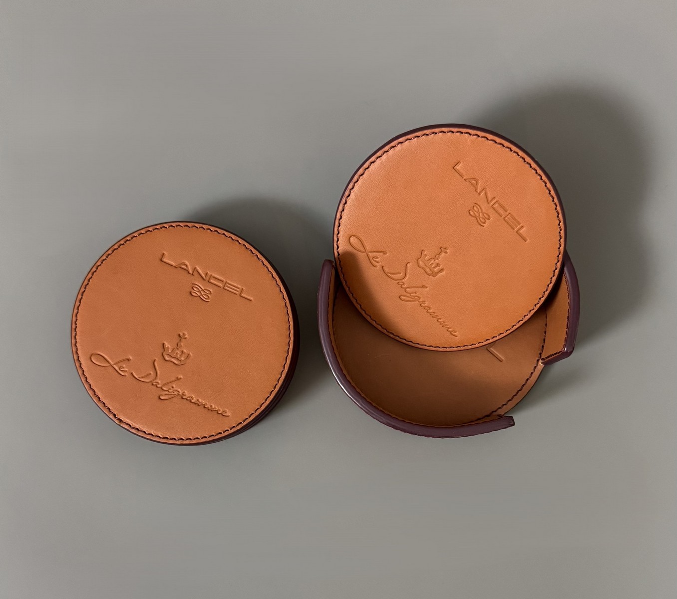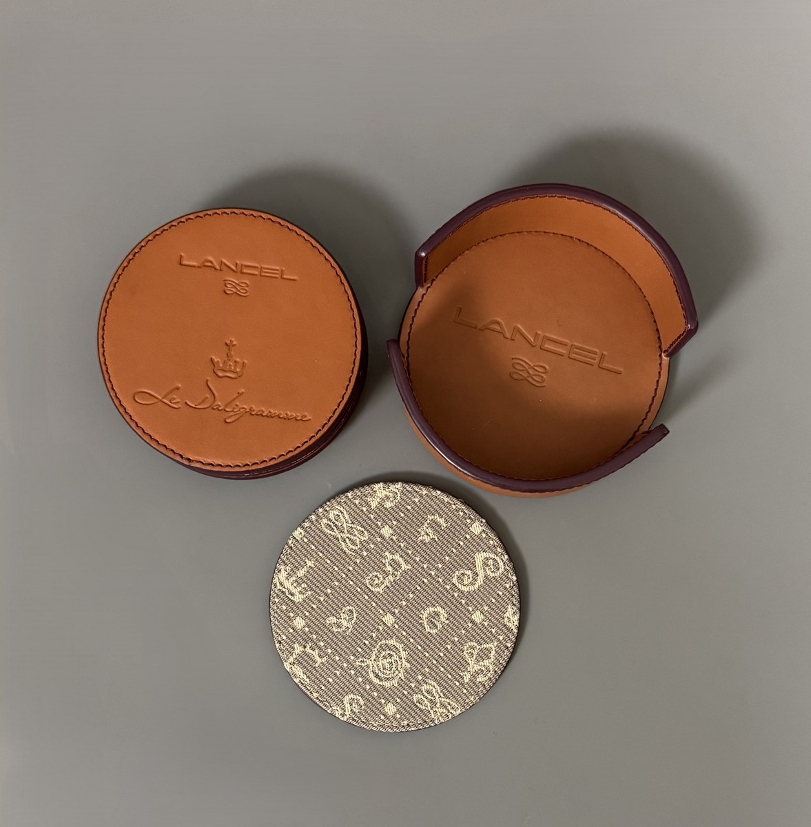 Ensemble de six sous-verres en cuir de vachette et tissu embossé, édités par la maison Lancel, marqués « Le Daligramme ». Dans son emboitage d’origine. Embossé sous l’emboitage « French légèreté depuis 1875 ». Diamètre : 10 cm.