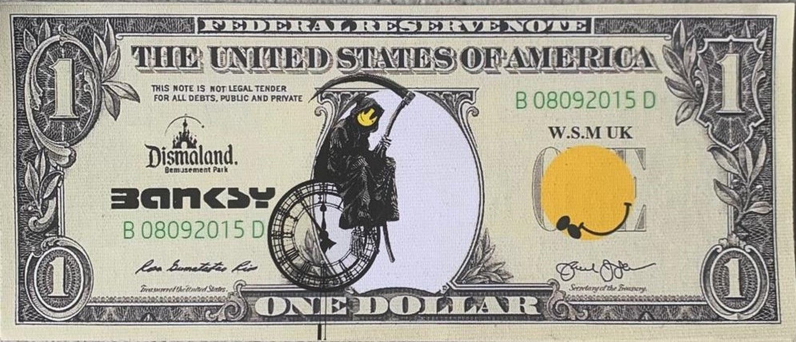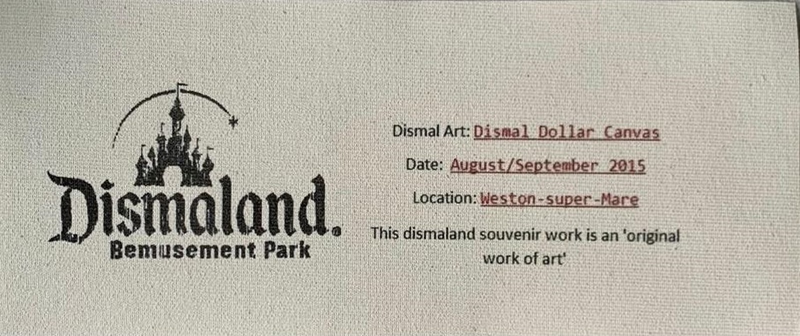 Certificat au dos de l’œuvre mentionnant « This is to certify that the work described above is an original work of art by Dismal Mouse, Acquis lors de Dismaland, l’évènement de Banksy à Weston Super Mare en Aout-Septembre 2015. Dimensions 12 x 27 cm environ