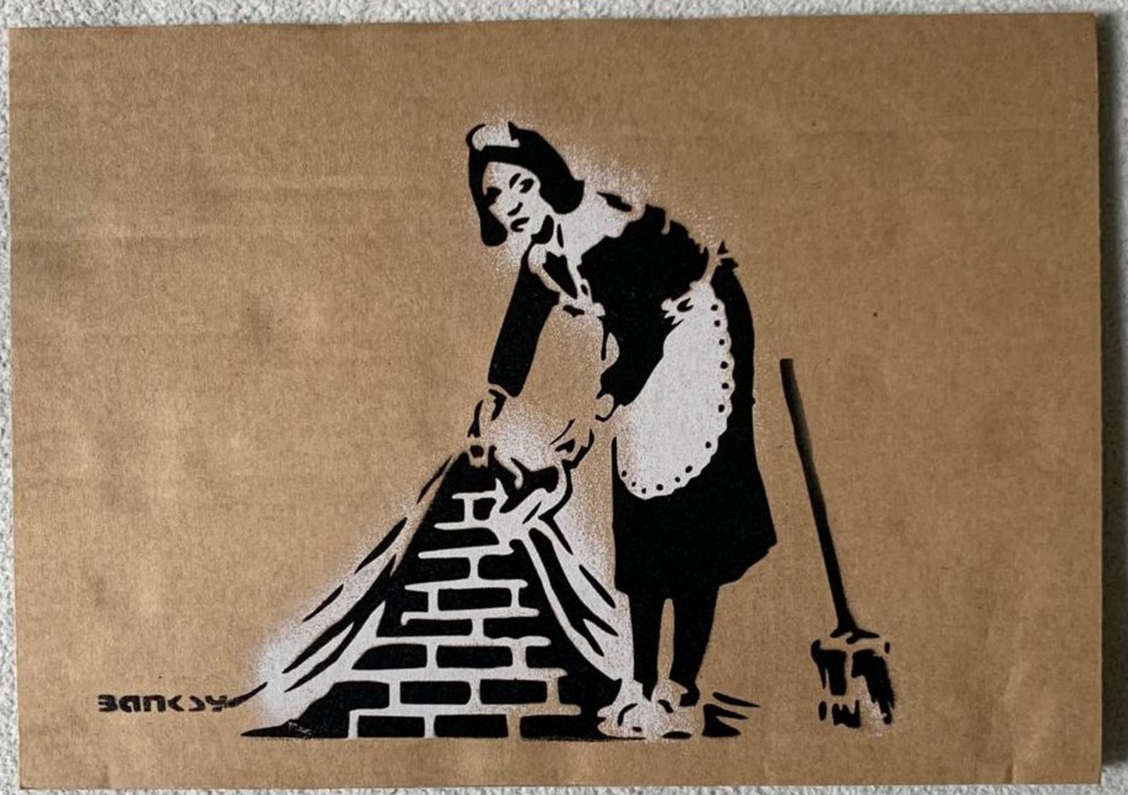Art gratuit de la peinture en aérosol au pochoir semé au parc à thème de Banksy « Dismaland » qui s’est tenu pendant deux mois, d’août à septembre 2015. Pendant la période d’exposition, Dismaland a organisé un Art Libre où ils cachent l’œuvre à divers endroits et vous pouvez l’emporter chez vous. (Certains dommages sur le carton en sont la cause.)