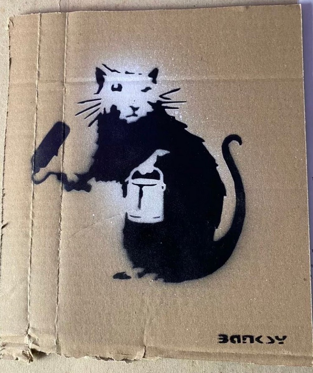 Art gratuit de la peinture en aérosol au pochoir semé au parc à thème de Banksy « Dismaland » qui s’est tenu pendant deux mois, d’août à septembre 2015. Pendant la période d’exposition, Dismaland a organisé un Art Libre où ils cachent l’œuvre à divers endroits et vous pouvez l’emporter chez vous. (Certains dommages sur le carton en sont la cause.)
