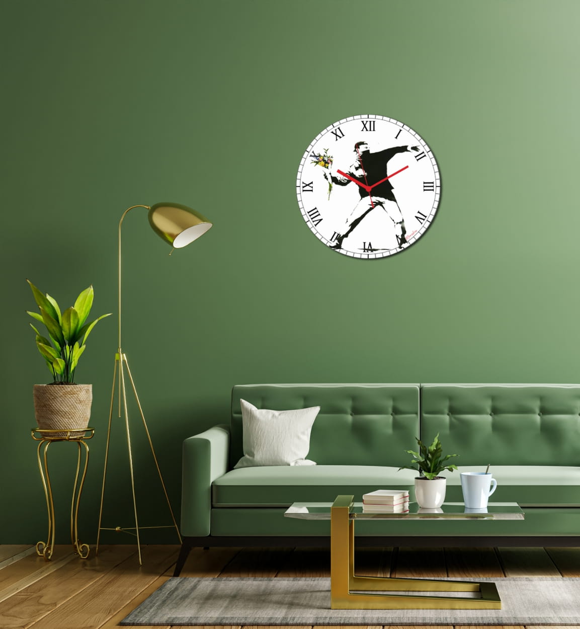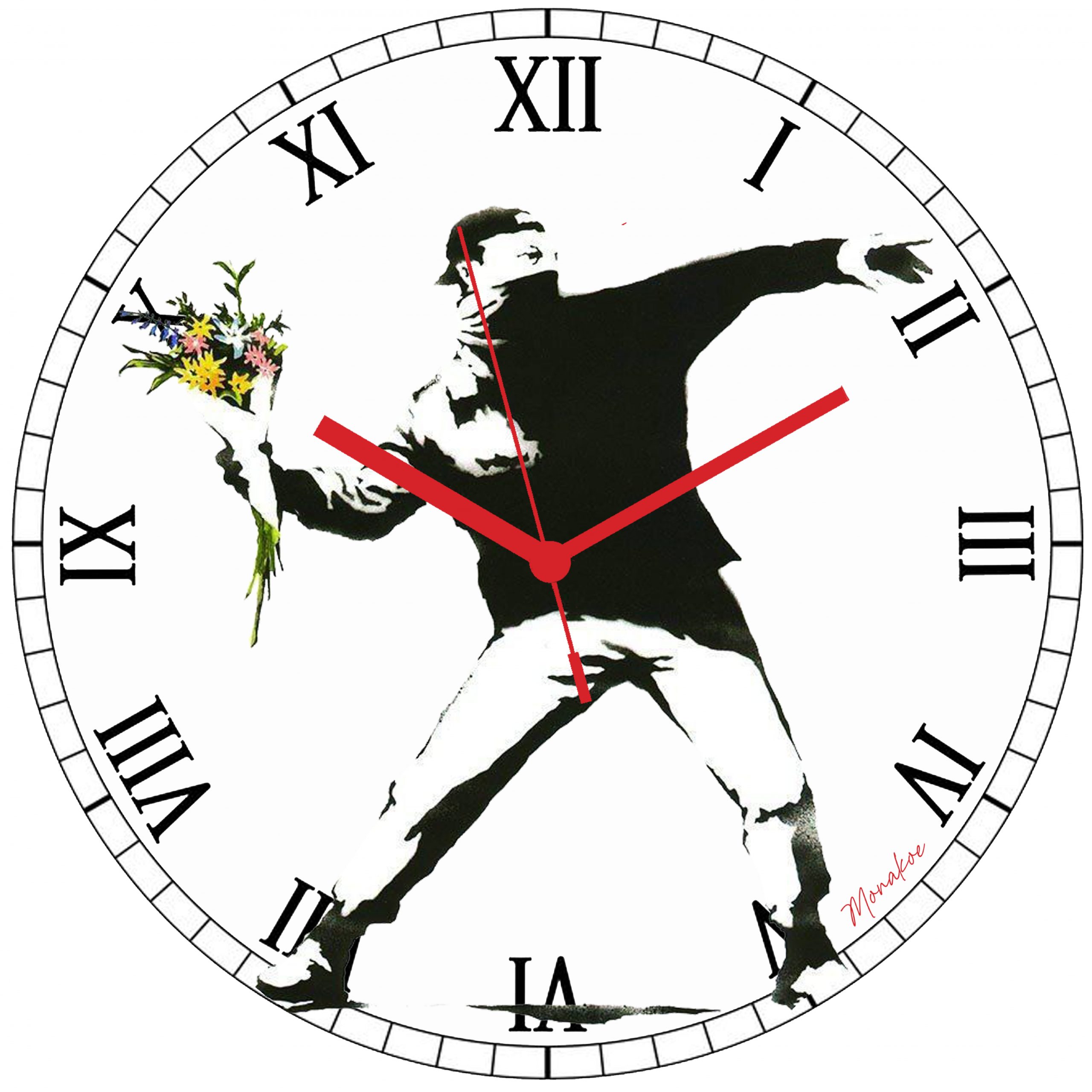Pendule murale fonctionnant à piles, inspiré du personnage de Banksy, Finition verre acrylique print, livré en caisse Américaine et attache murale, signé et édité à 10 exemplaires.