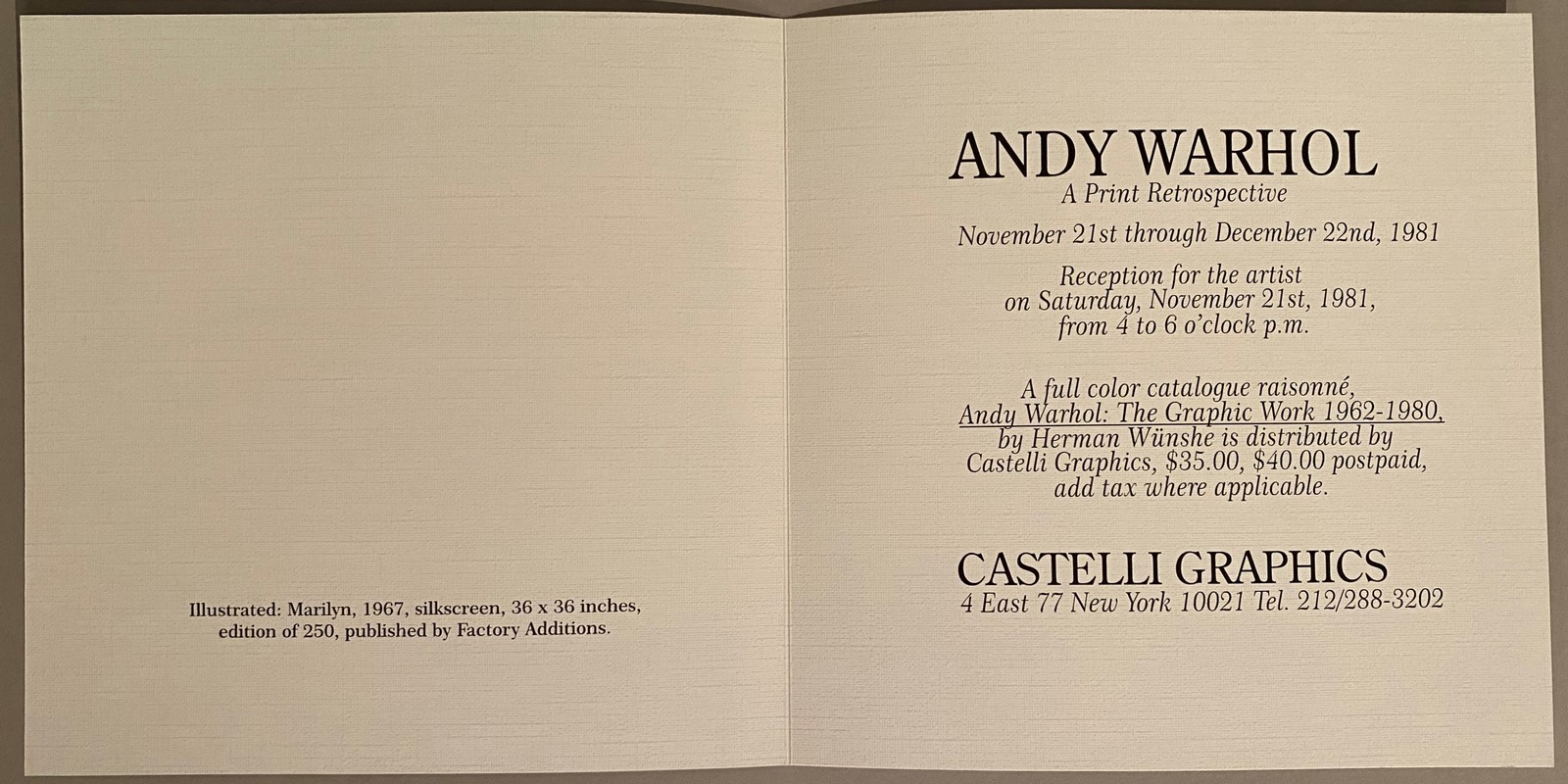Sérigraphie en couleur sur carton de l’Exposition « Andy Warhol- A Print Retrospective, Nov.-dec.1981, Castelli Graphics, NY » en présence de l’Artiste.