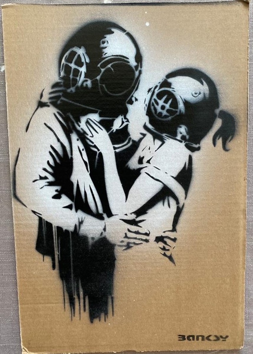 Art gratuit de la peinture en aérosol au pochoir semé au parc à thème de Banksy « Dismaland » qui s’est tenu pendant deux mois, d’août à septembre 2015. Pendant la période d’exposition, Dismaland a organisé un Art Libre où ils cachent l’œuvre à divers endroits et vous pouvez l’emporter chez vous. (Certains dommages sur le carton en sont la cause.)