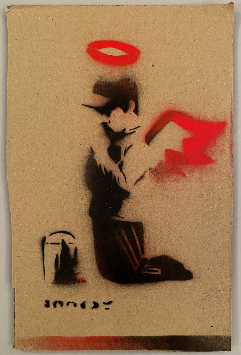 Art gratuit de la peinture en aérosol au pochoir semé au parc à thème de Banksy « Dismaland » qui s’est tenu pendant deux mois, d’août à septembre 2015. Pendant la période d’exposition, Dismaland a organisé un Art Libre où ils cachent l’œuvre à divers endroits et vous pouvez l’emporter chez vous. (Certains dommages sur le carton en sont la cause.) Livré avec ticket original d’entrée et Map Dismaland.