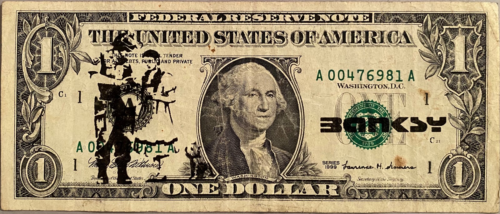 Cachets sur véritable billet d’un dollar Cachet de la signature et cachet de Dismaland au pochoir 6,5 x 15,5 cm