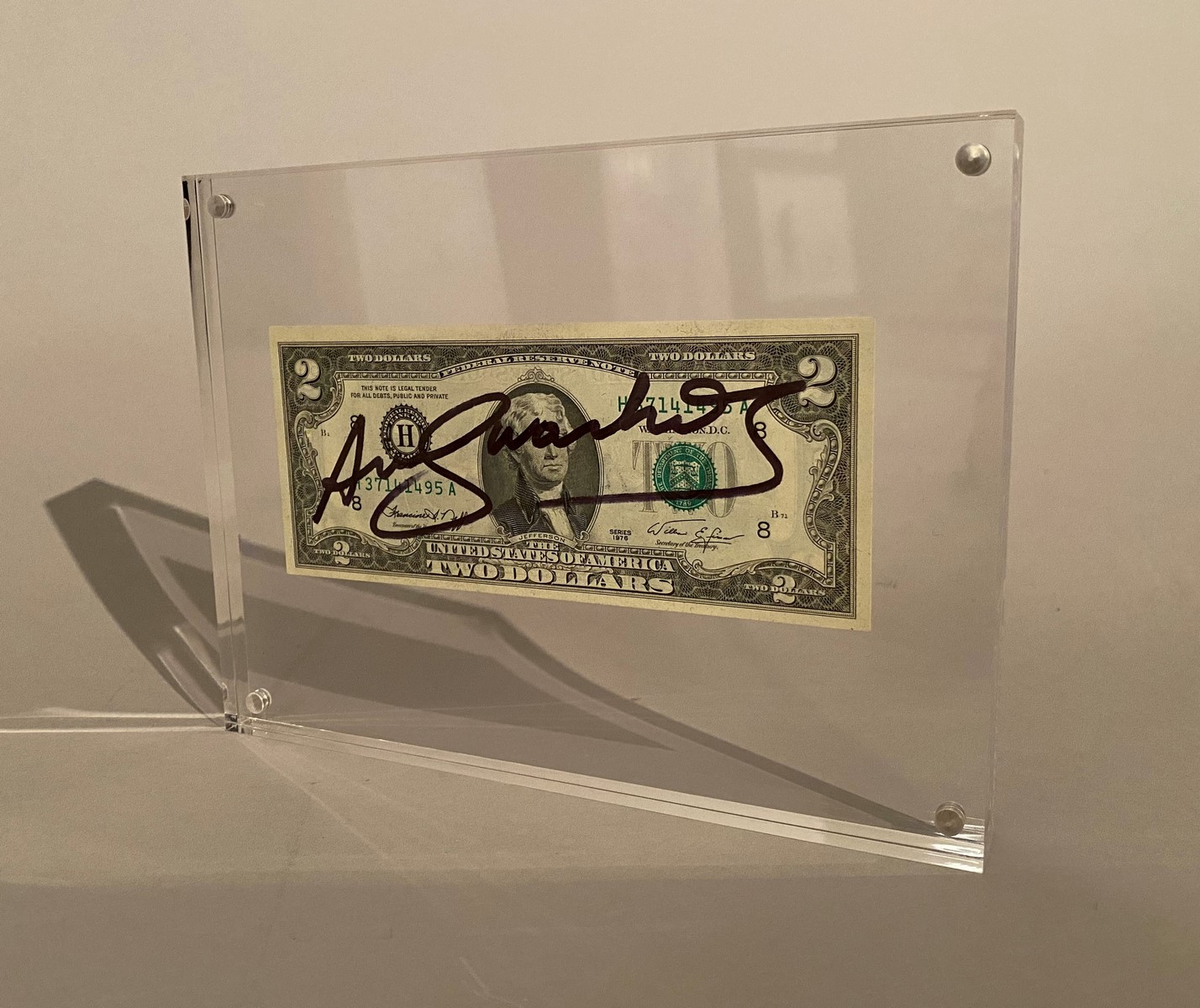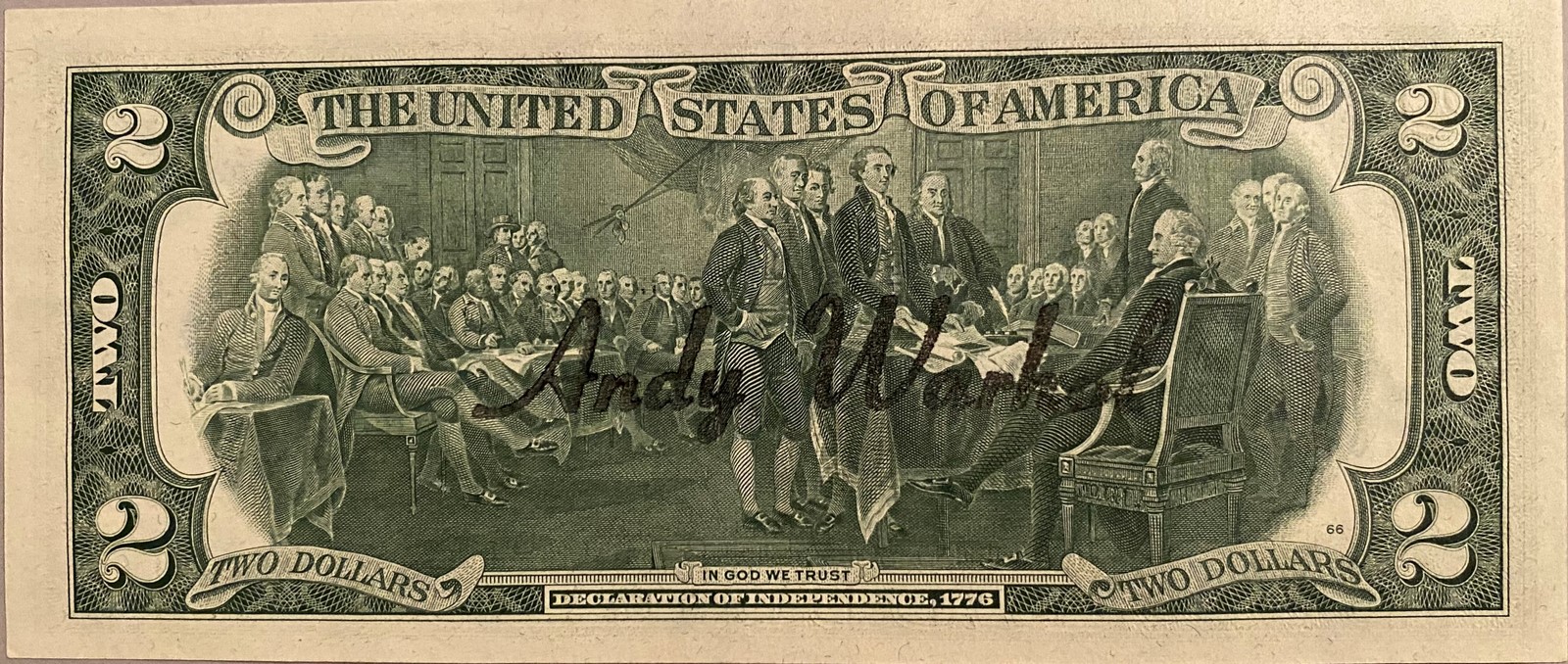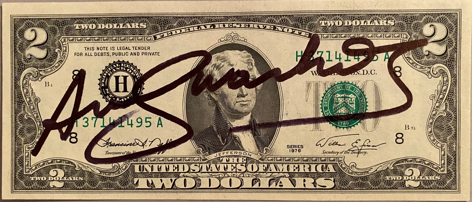 Billet de 2 dollars américain 1976, n°F24154086A, signé au marqueur noir.
