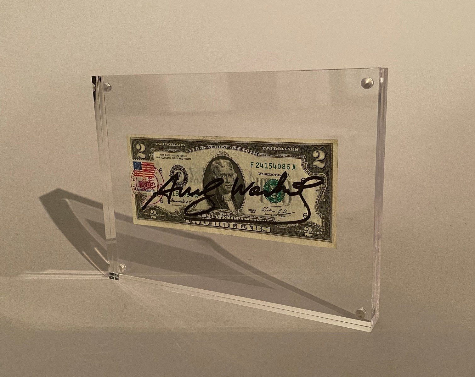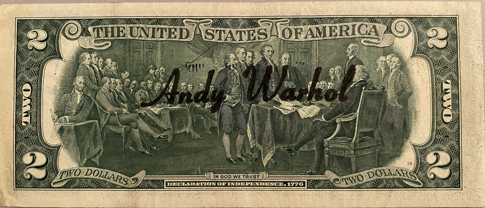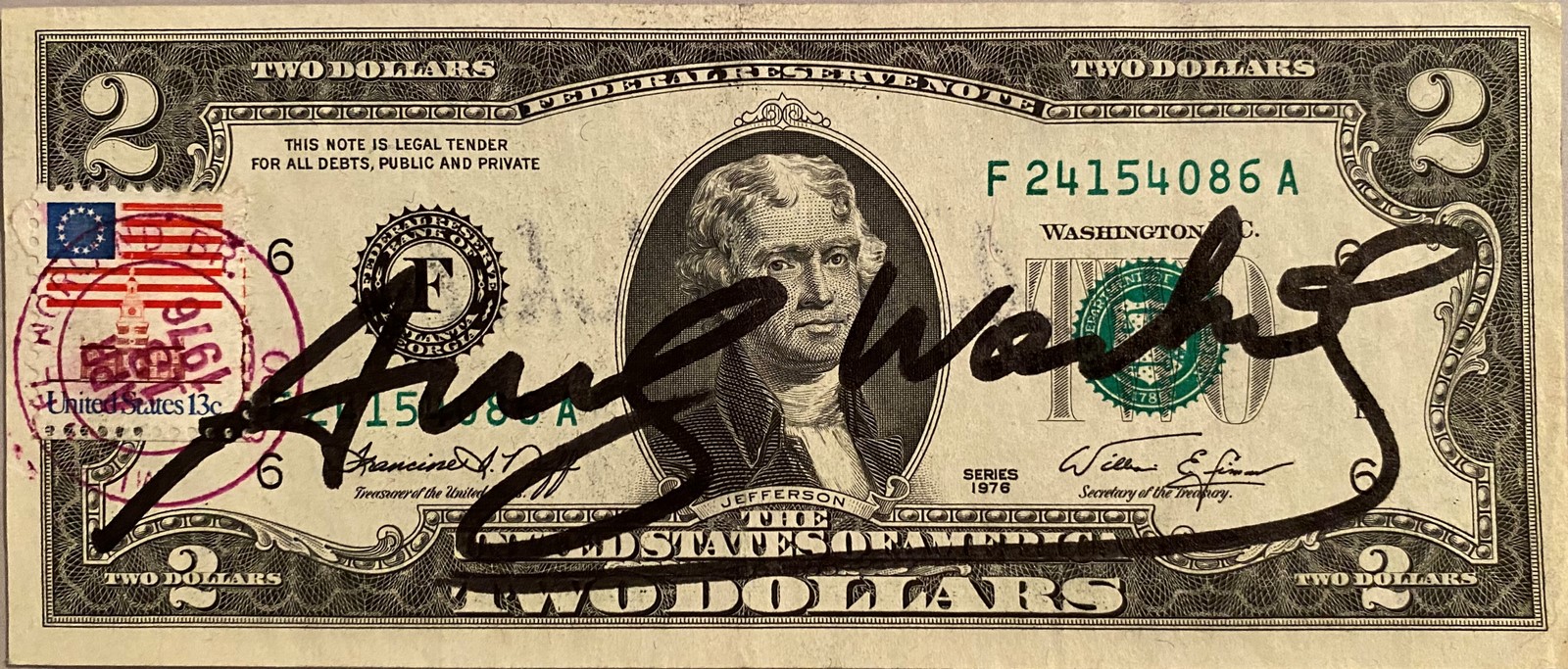 Billet de 2 dollars américain 1976, n°H37141495A, signé au marqueur noir.
