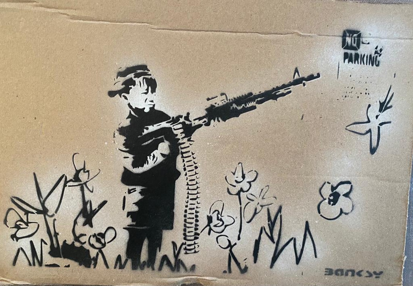 Art gratuit de la peinture en aérosol au pochoir semé au parc à thème de Banksy « Dismaland » qui s’est tenu pendant deux mois, d’août à septembre 2015. Pendant la période d’exposition, Dismaland a organisé un Art Libre où ils cachent l’œuvre à divers endroits et vous pouvez l’emporter chez vous. (Certains dommages sur le carton en sont la cause.)