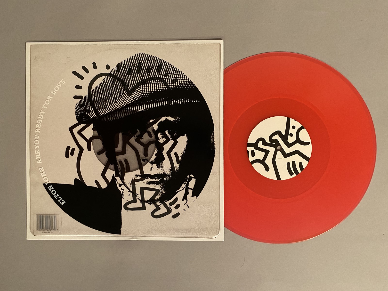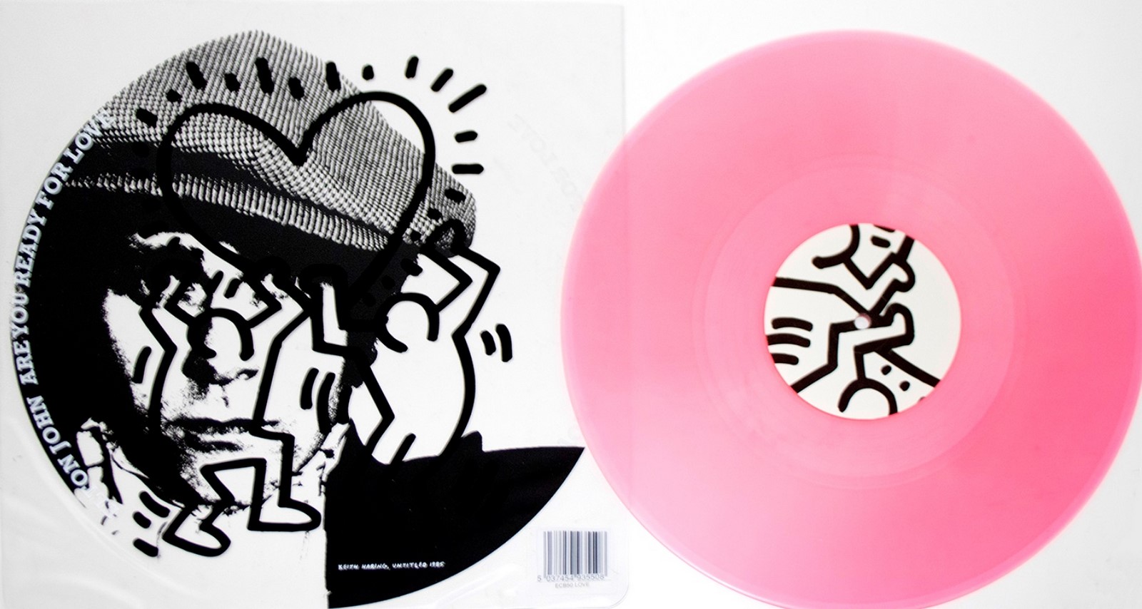 Disque vinyle rose et pochette de disque vinyle rose sérigraphiée d’une composition de l’artiste.