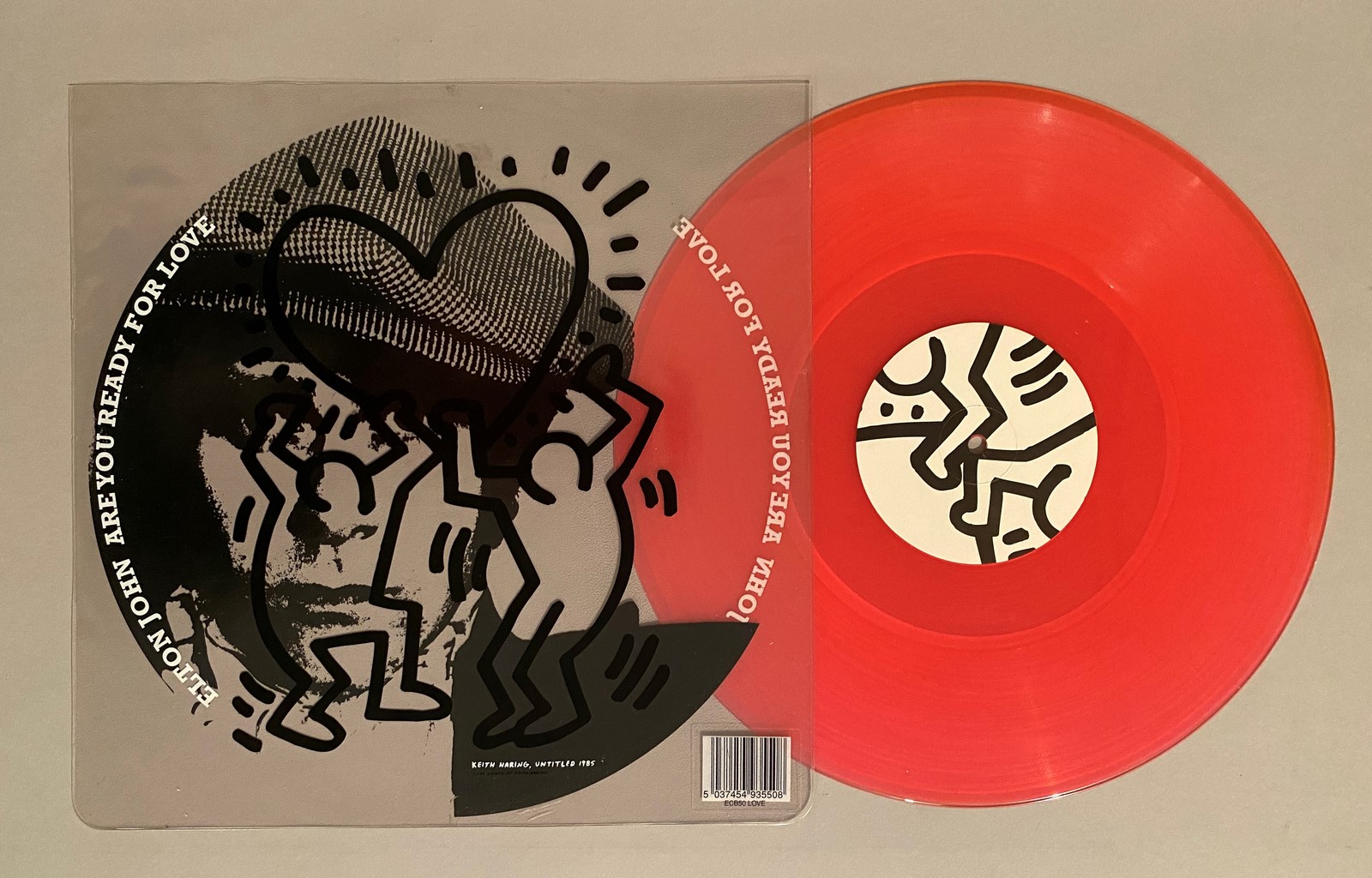 Disque vinyle rose et pochette de disque vinyle rose sérigraphiée d’une composition de l’artiste.