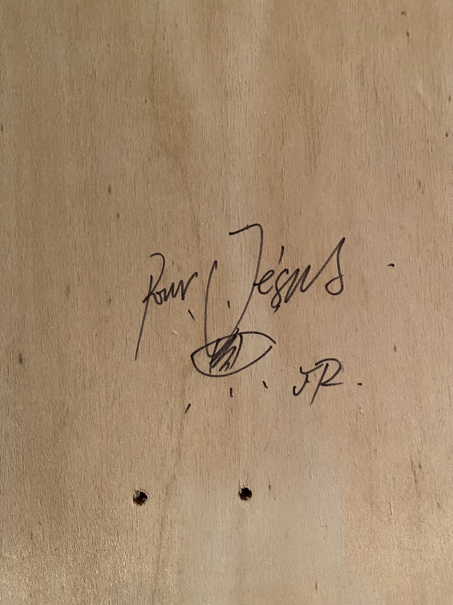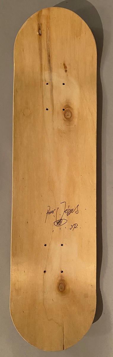 Planche de skateboard dédicacé et porte un dessin par l’artiste JR.