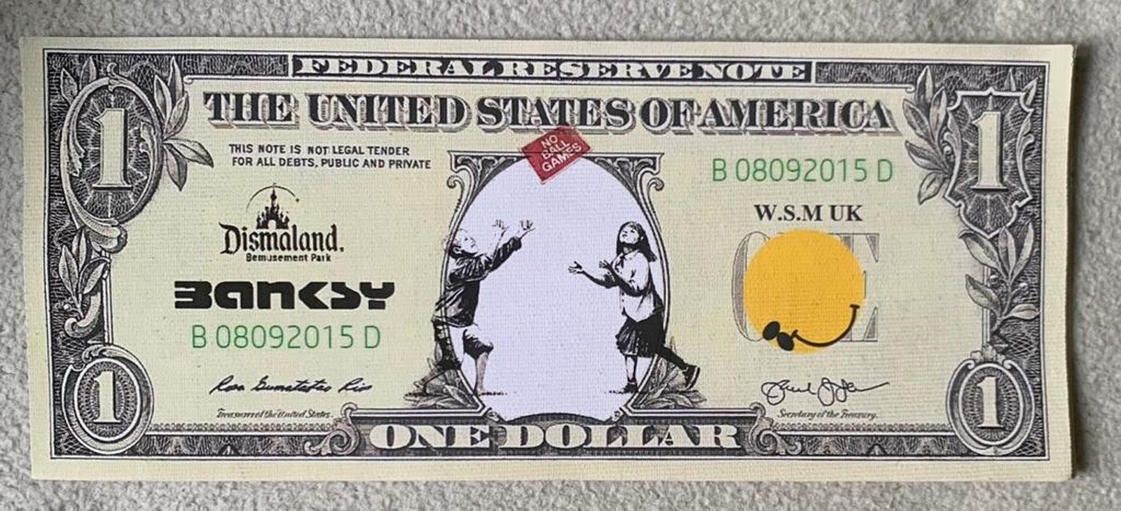 Certificat au dos de l’œuvre mentionnant « This is to certify that the work described above is an original work of art by Dismal Mouse, Acquis lors de Dismaland, l’évènement de Banksy à Weston Super Mare en Aout-Septembre 2015.